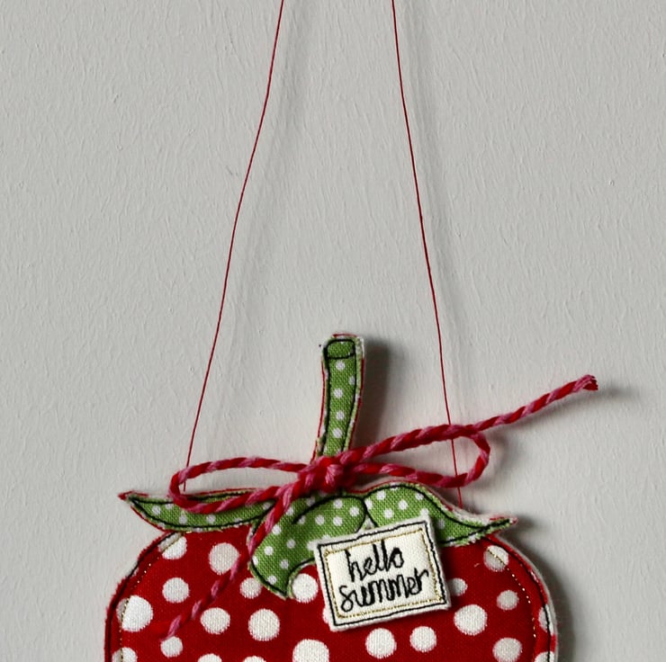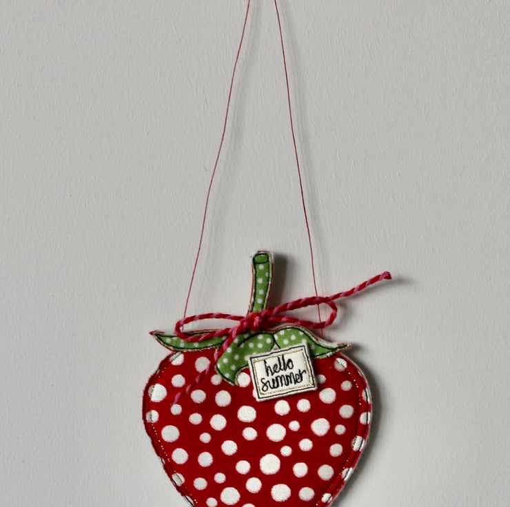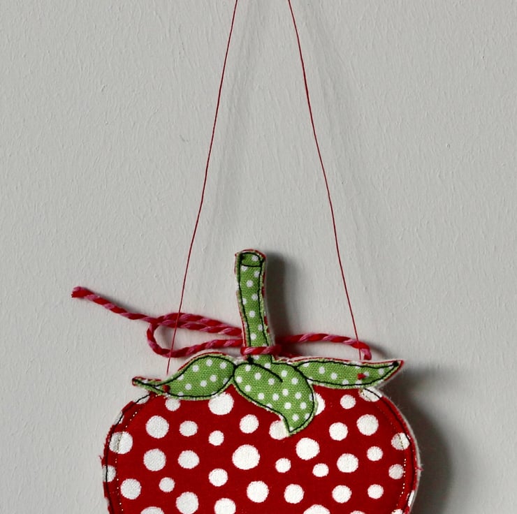 Strawberry is sewn using cotton cloth, 100% wool felt, metallic thread and free hand machine embroidery; multiple layers of cloth are sewn together and cut out by hand using sharp scissors. With a linen string to suspend.