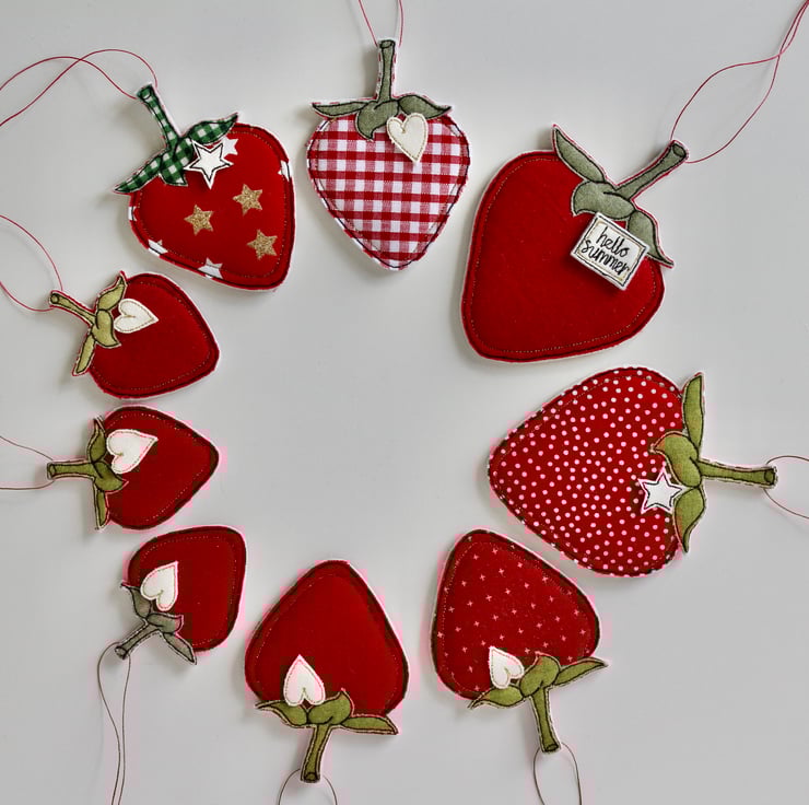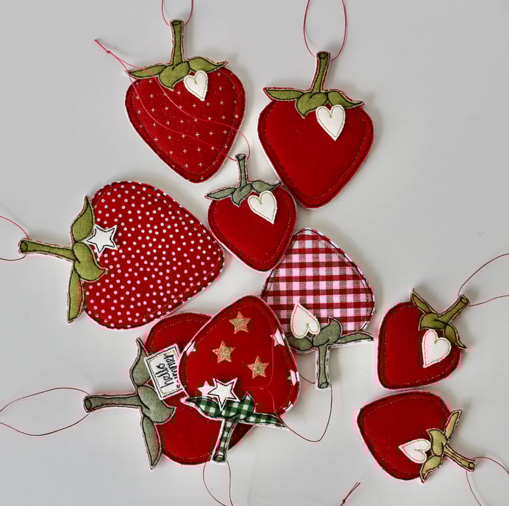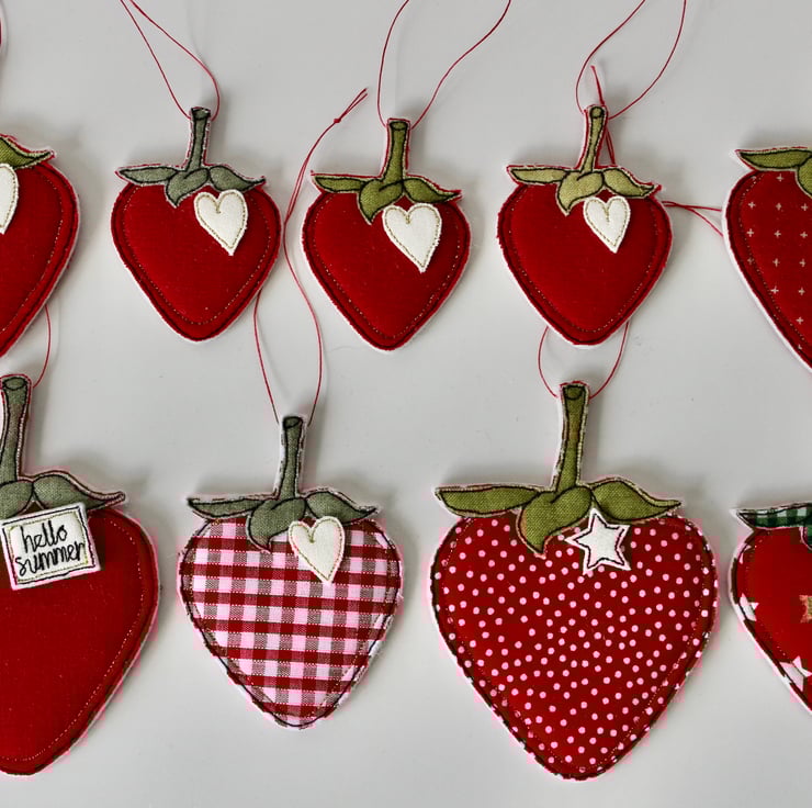 Strawberries are sewn using cotton cloth, 100% wool felt and free hand machine embroidery; multiple layers of cloth are sewn together and cut out by hand using sharp scissors. With linen strings to suspend.