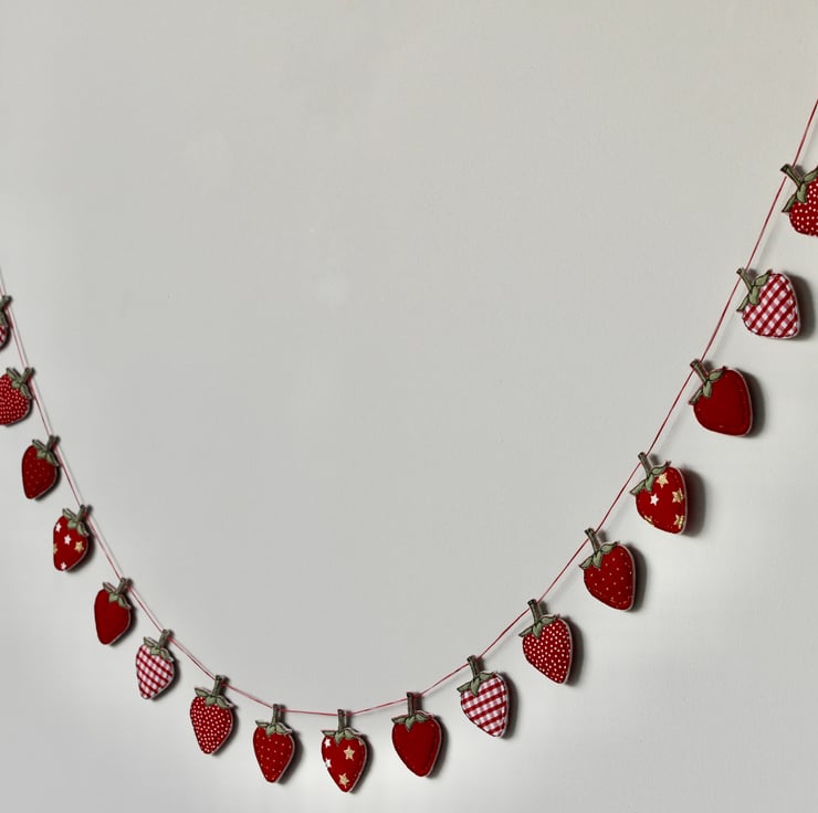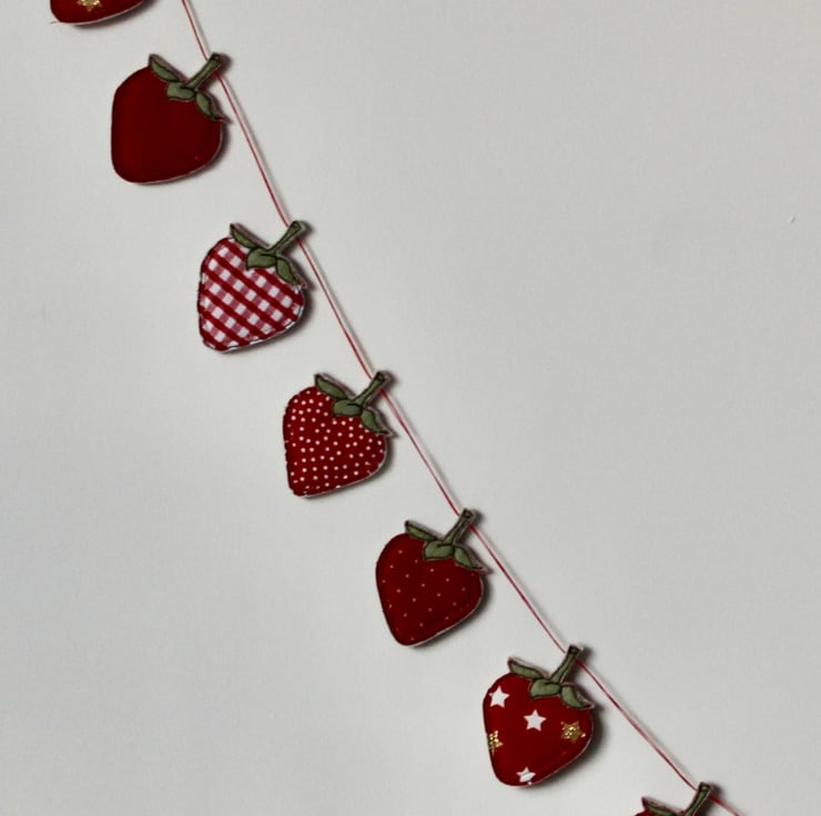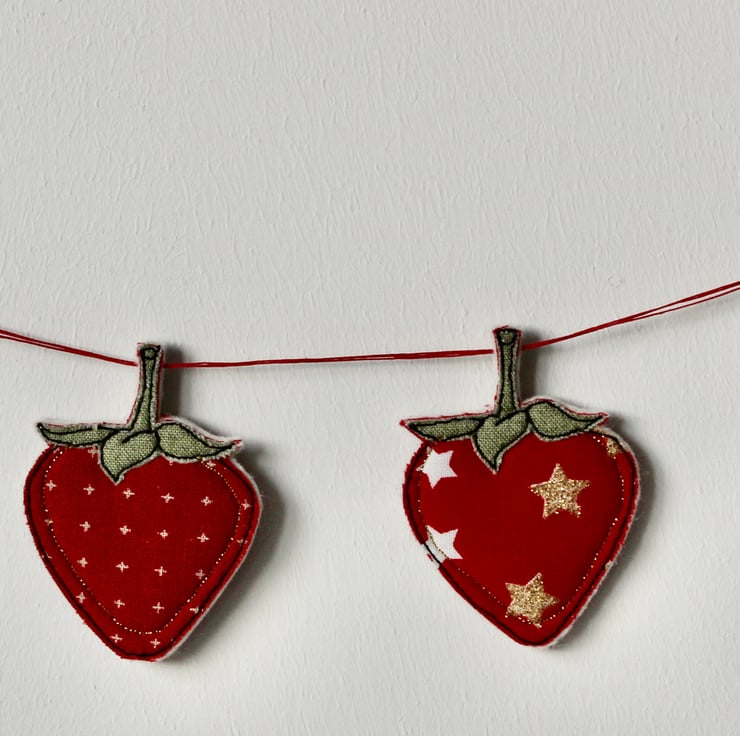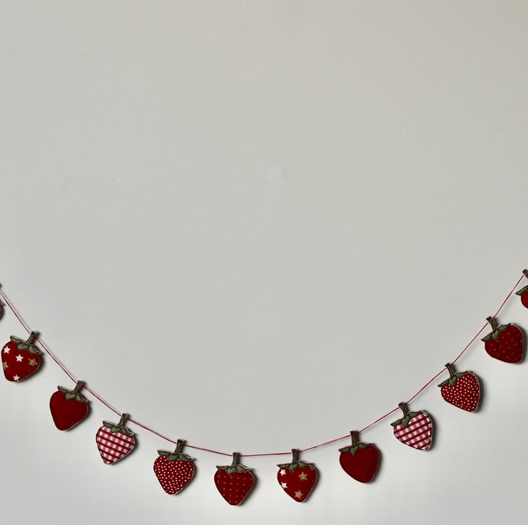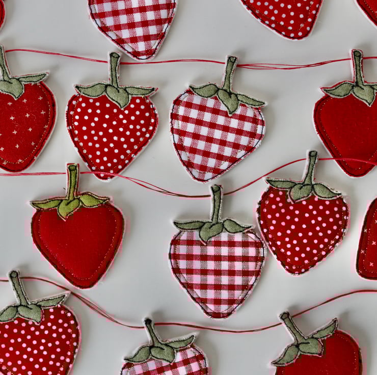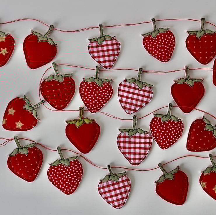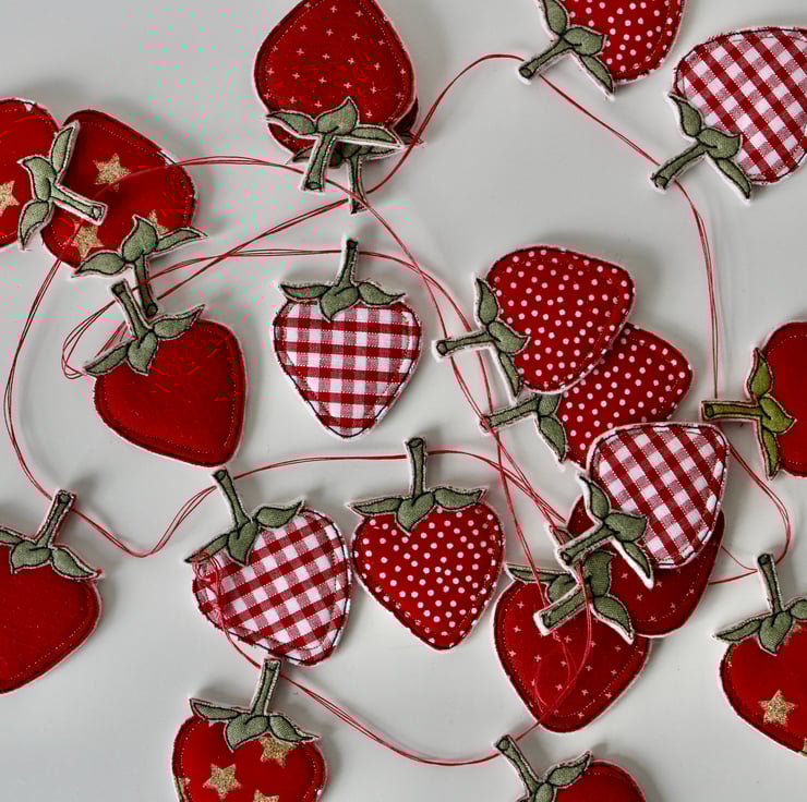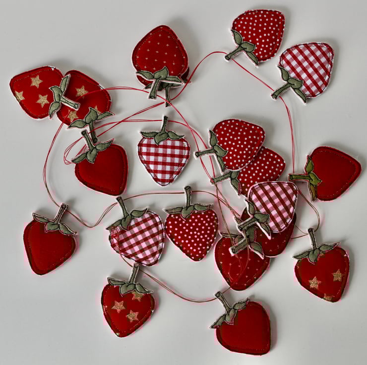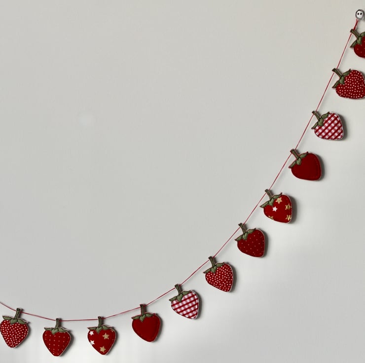 Each of the twenty strawberries suspended along this garland, is sewn using a combination of 100% wool felt, cotton cloth and free hand machine embroidery; multiple layers of cloth are sewn together and cut out by hand using very sharp scissors.