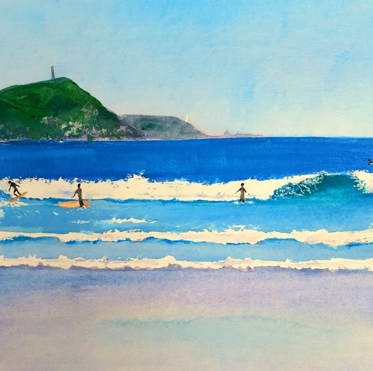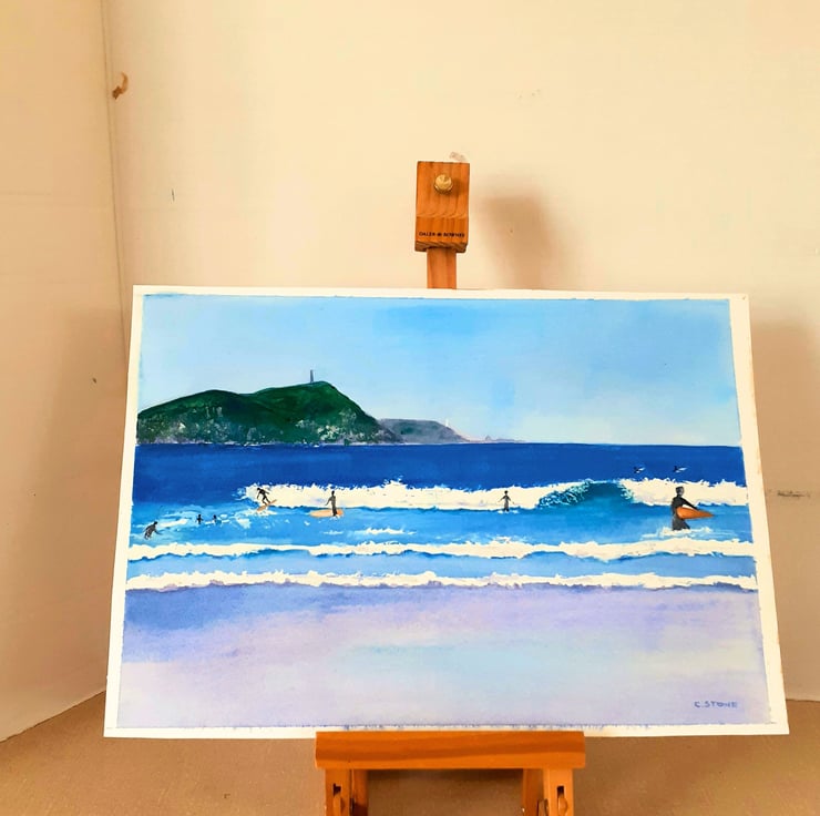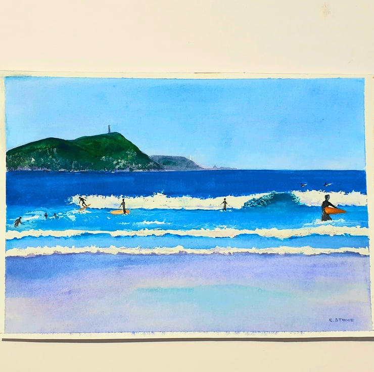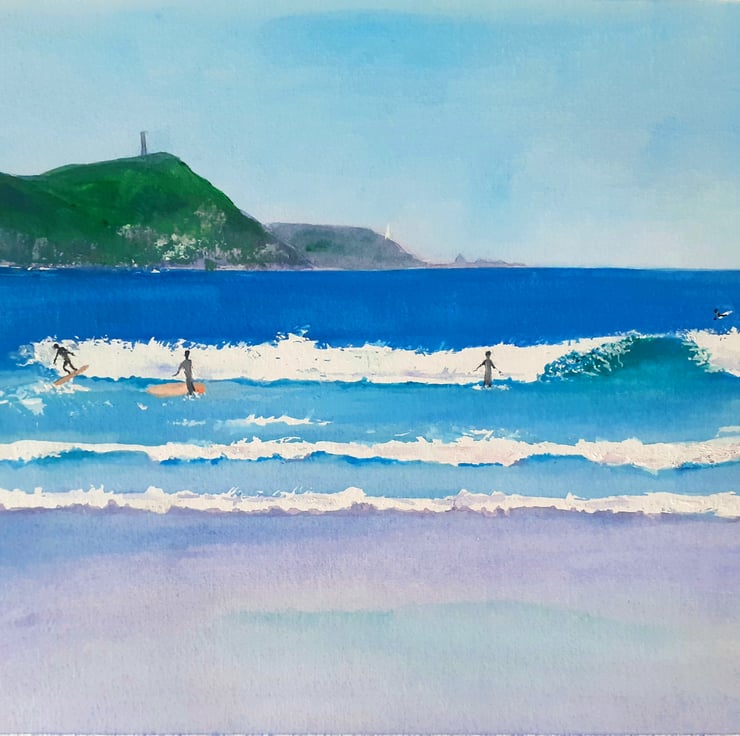 This original gouache painting of Polzeath Beach on the North Cornwall coast is based on my own photographs and sketches. from earlier this summer. with surfers enjoying the Atlantic waves.