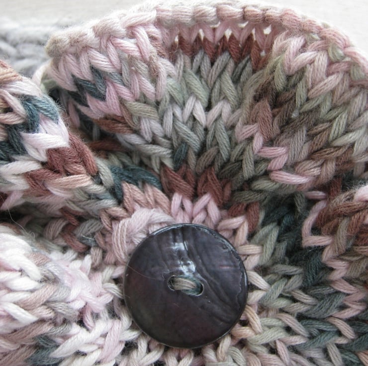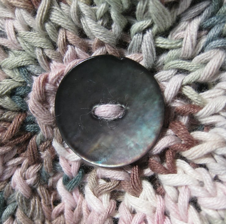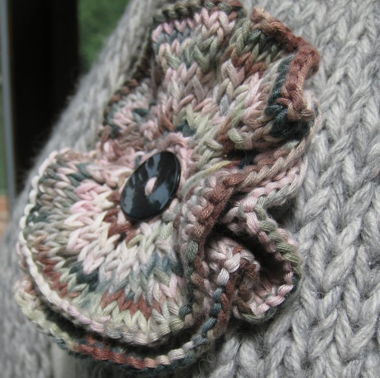Soft and floppy flower brooch, hand knitted from a scrap of space-dyed cotton yarn of pastel shades of light and dark brown, finished with a glossy grey shell button.