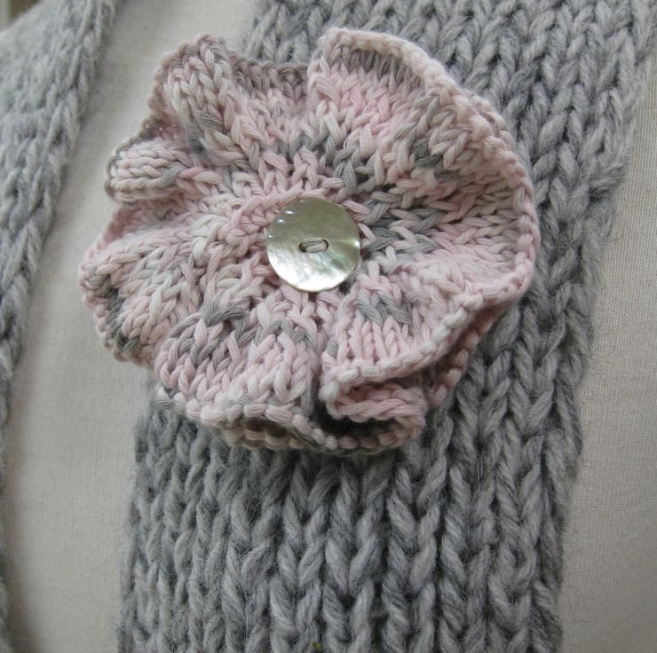 Soft and floppy flower brooch, hand knitted from a scrap of space-dyed cotton yarn of dove grey and palest pink, finished with a glossy natural shell button.