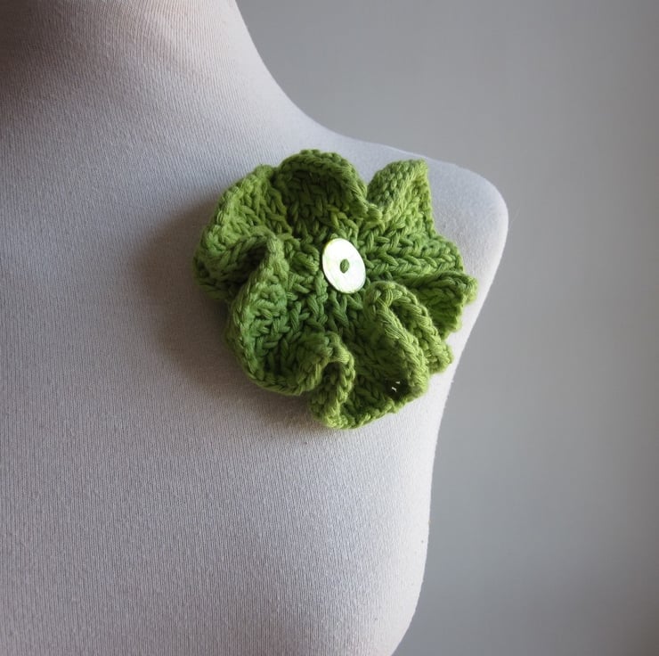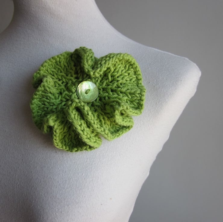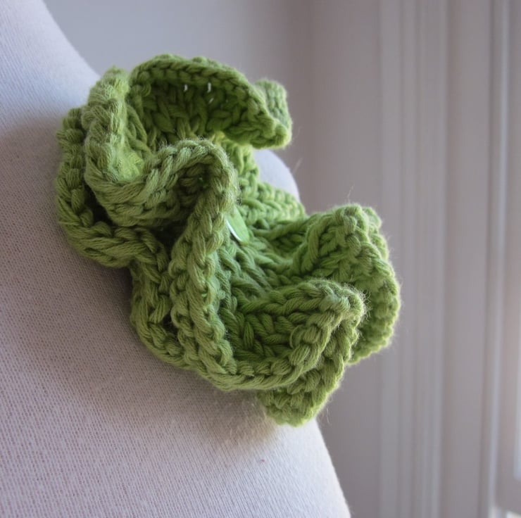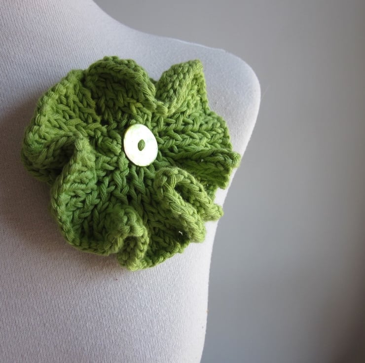 Hand knitted in a gorgeous celery green cotton yarn, twisted and folded into shape and finished with a glossy dark green shell button.