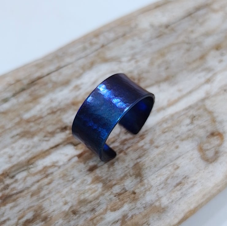 I have made this beautiful ring from 1 mm titanium sheet which I have hand sawed, carefully finished, polished and applied a line hammer texture to it. I have then torch coloured the titanium before sanding back and recolouring to create an interesting effect