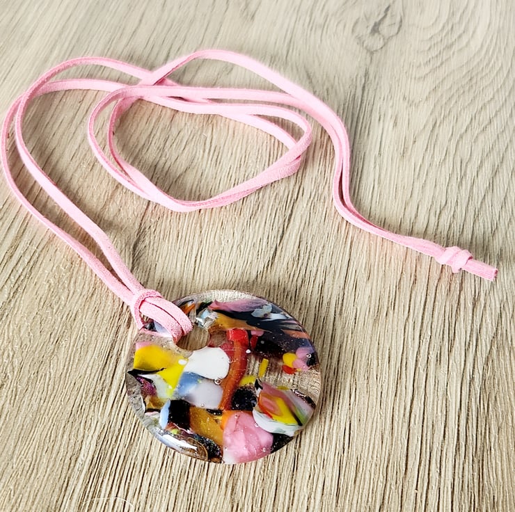 This fused glass pendant is a true statement piece that will elevate any outfit. The pendant is made by casting glass in a mold, giving it a unique texture and shape. The soft suede adds a beautiful contrast to the glass and makes it comfortable to wear. Whether you're dressing up or down, this pendant is perfect for any occasion.