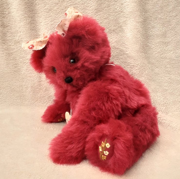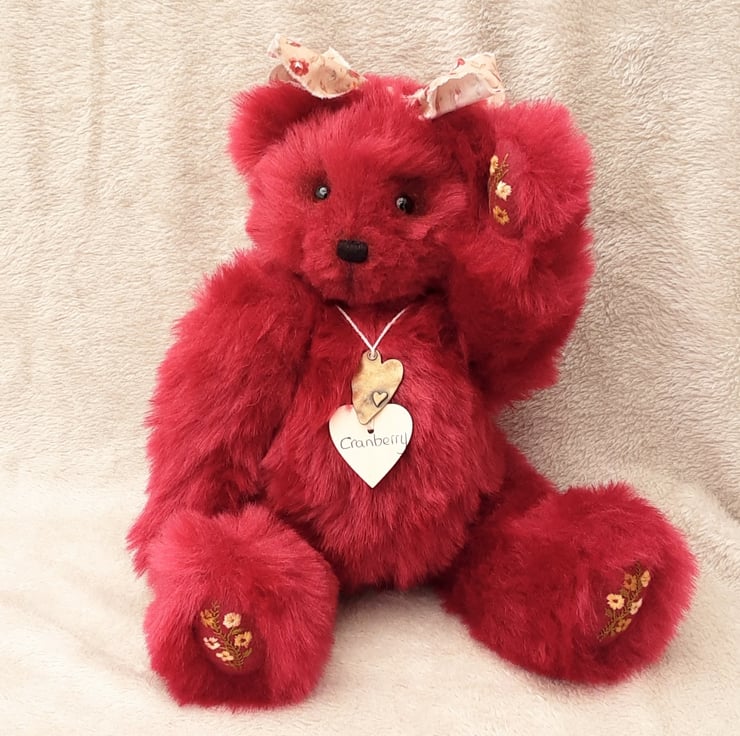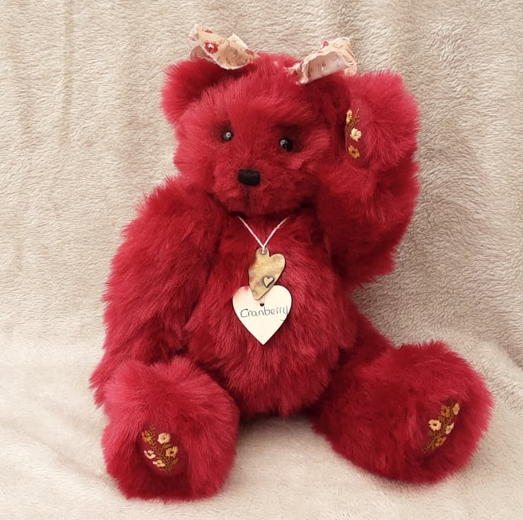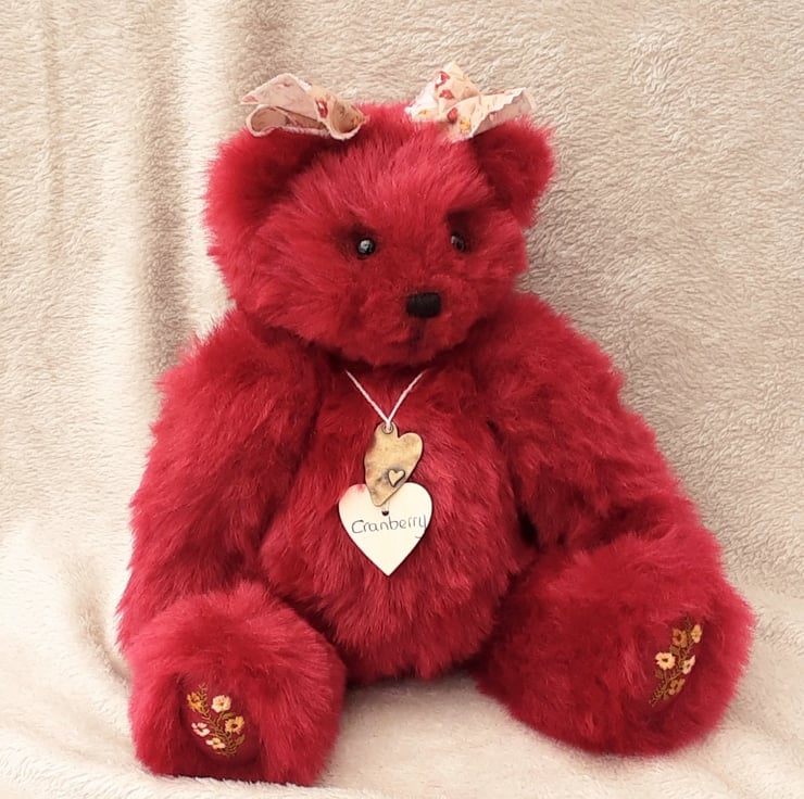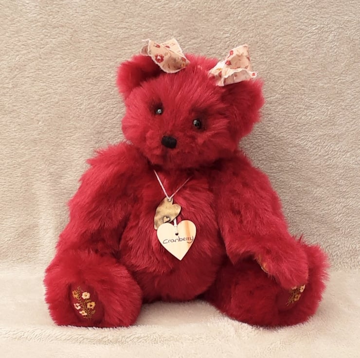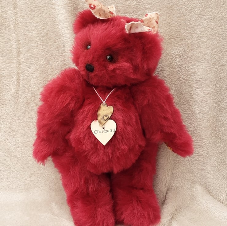 Cranberry wears her name on a wooden tag with a little heart pendant, she will arrive with birth certificate. Bearlescent is to the back of one ear on a polymer clay button.