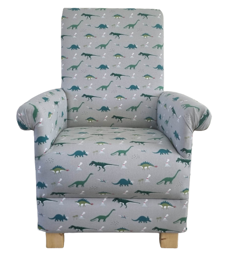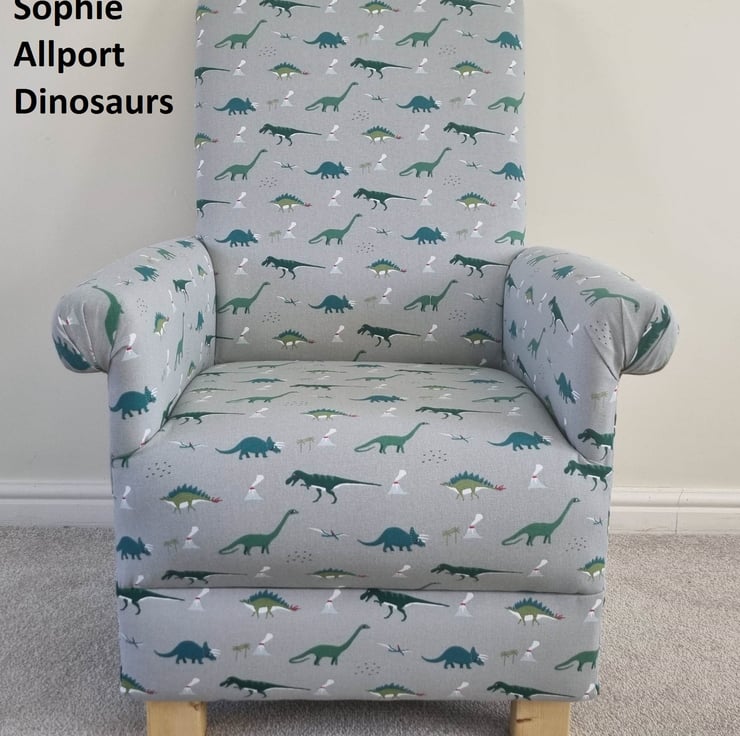 This is a handcrafted, sturdy adult sized armchair, which has been made by myself, a professional upholsterer with over 32 years experience, using Sophie Allport Dinosaurs fabric.