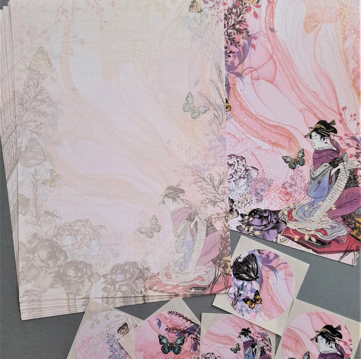 The paper has feint 7mm rules / lines, printed up to the edge in full colour on one side onto 100gsm white paper, which is suitable for most ink types. Item includes 5 circular co-ordinating self-adhesive envelope seals and an A5 art print.