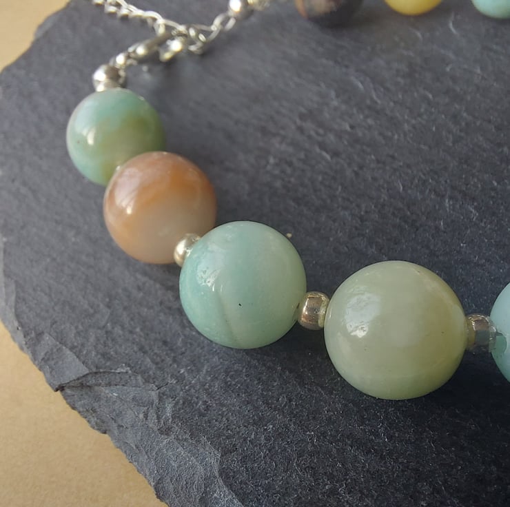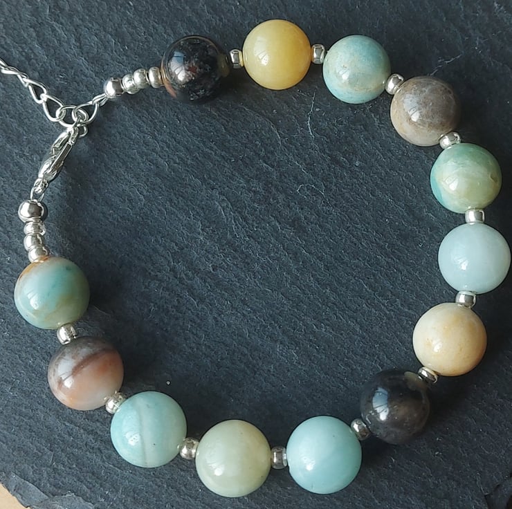 A genuine semi-precious bracelets, made with 8mm Amazonite rounds and 8° seed beads. Will fit 6.5-8.5" wrist. The findings are silver-plated.