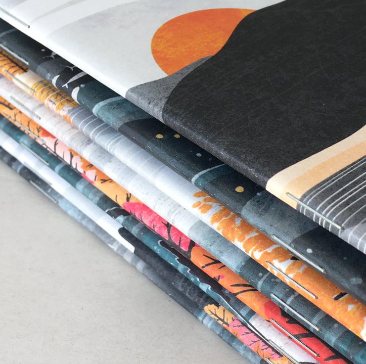 Individual A6 100% recycled paper notebooks. There are multiple designs from four collections to choose from. Please scroll through the images to see all of the designs.