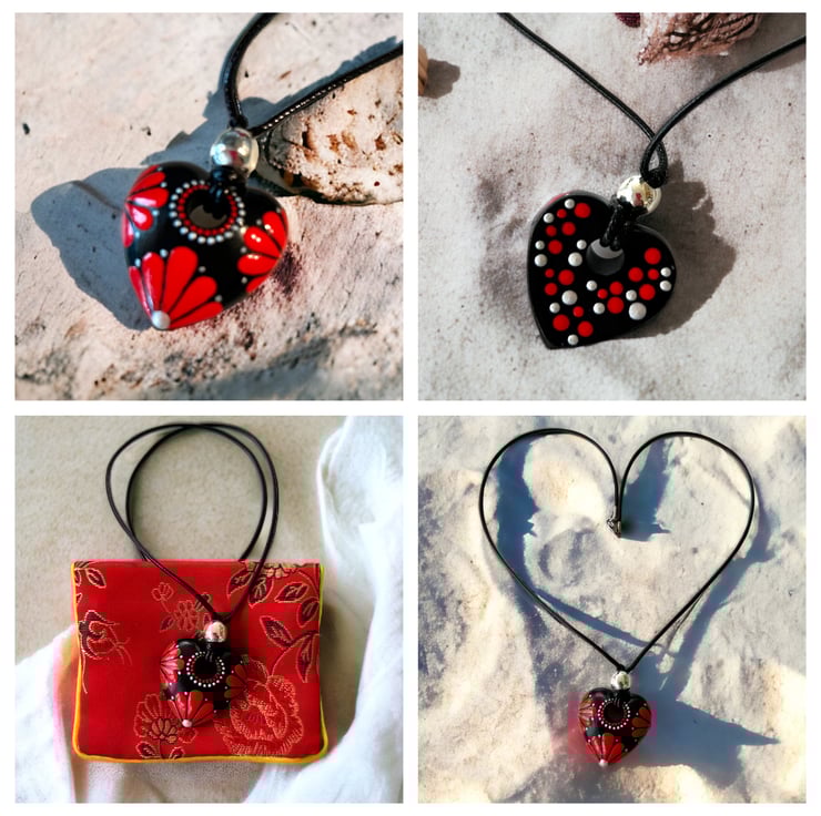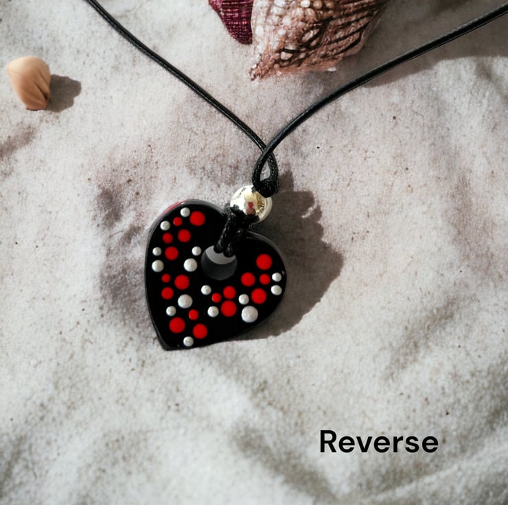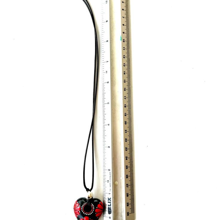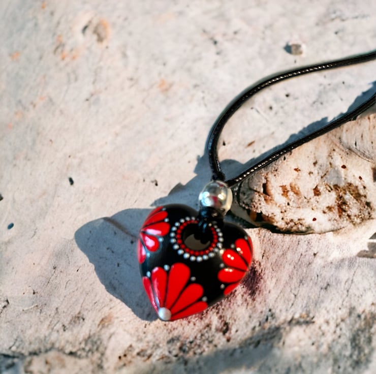 A sweet boho-style pendant, hand-painted in a simple design of red daisy-like petals. The reverse of the pendant is decorated with red and pearl dots. The pendant was cast from a small mould and is made of lightweight yet strong casting plaster. Two coats of high quality satin varnish protect the pendant from UV.