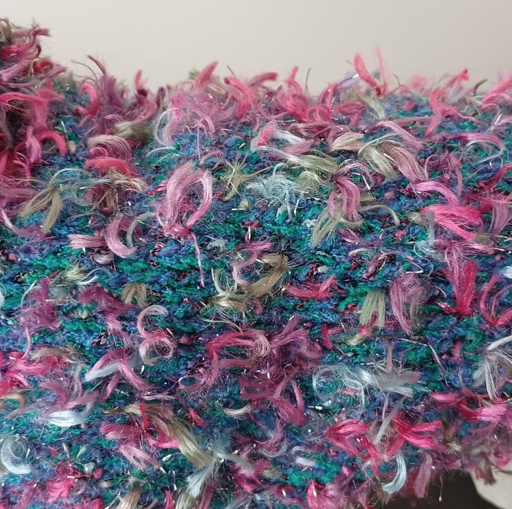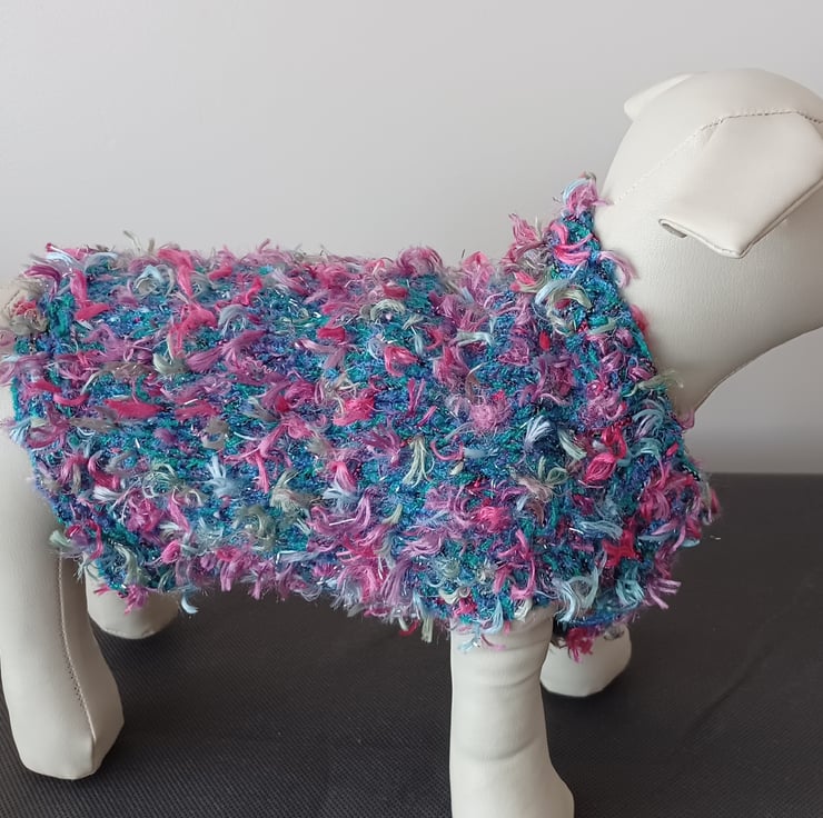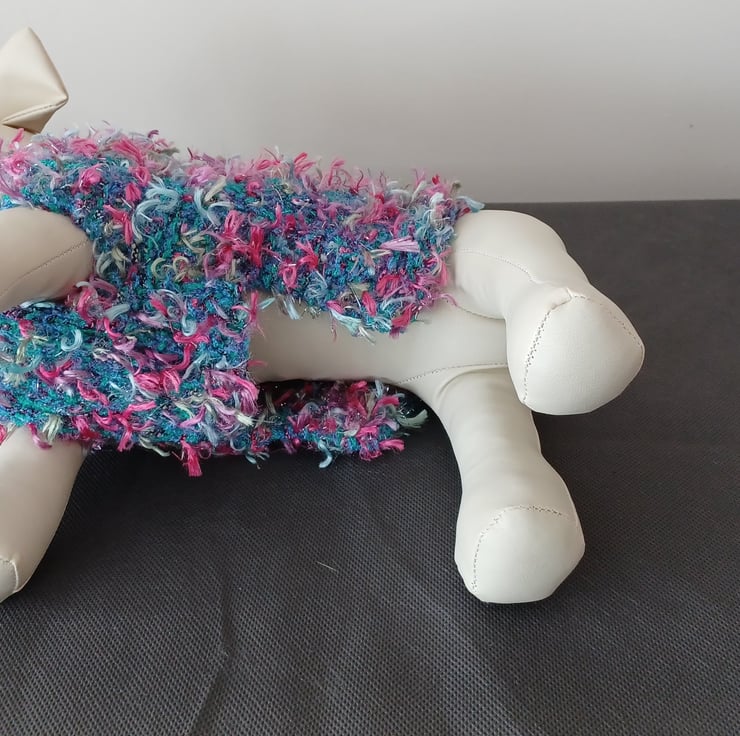 This is a hand knitted dog coat in a thick jade green yarn with tufts of pinks, blue and green. It has a short loose neck which would be able to accommodate a lead, there are gaps for the legs to go through.