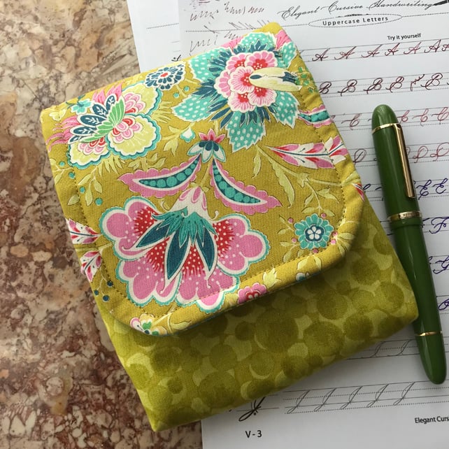 The outer, padded case contains a removable stiffened insert with fabric loops to hold, separate and protect the pens. All visible fabrics are 100% cotton. Three types of interlining provide cushioning, support and stability. The pen slots are 10 cm long so give excellent protection and will house all but the chunkiest of pens, while the tuck-under outer flap adjusts to accommodate extra-long pens. There is space behind the insert in which to tuck a note of pens and inks, plus a small slim notebook. Only a very limited number of each case will be made.