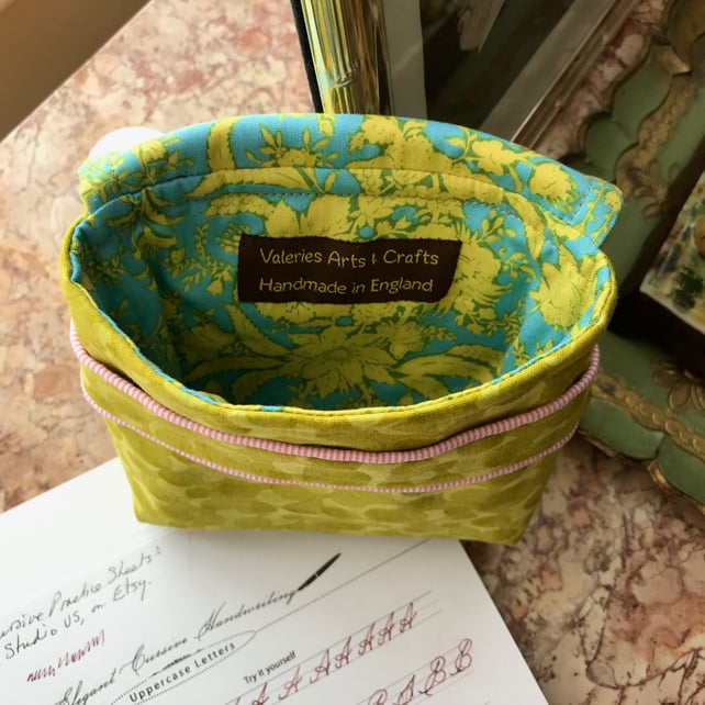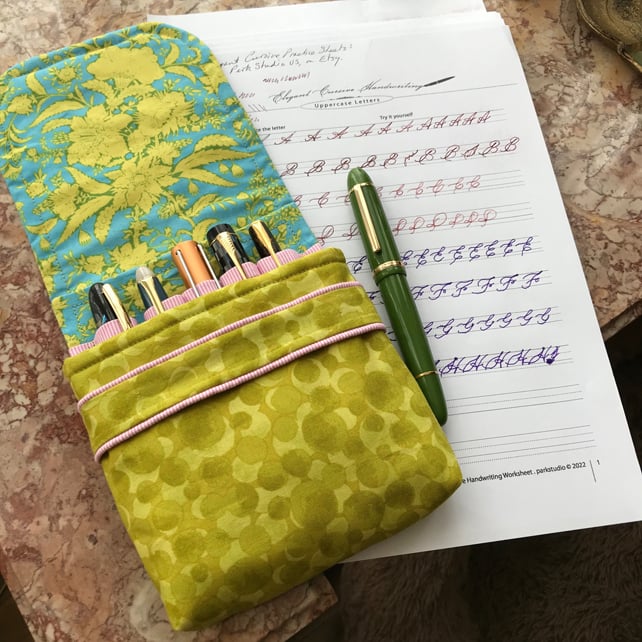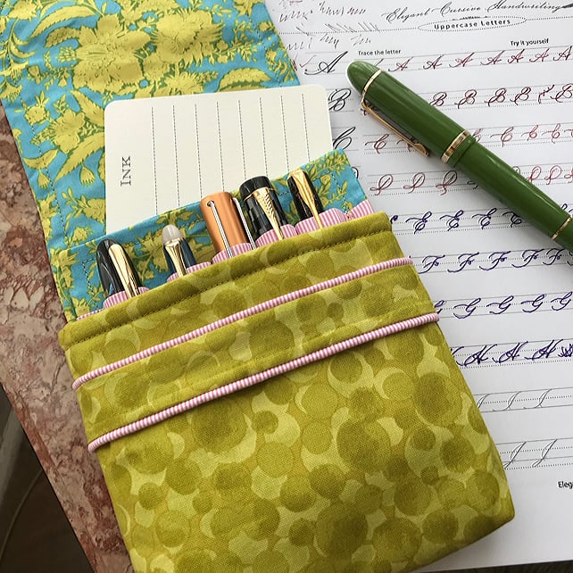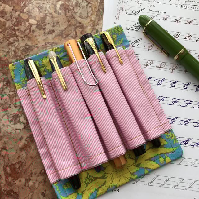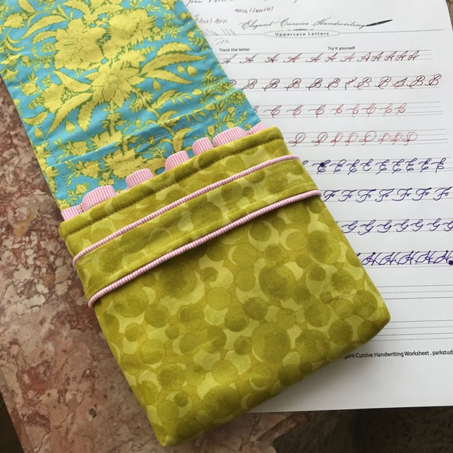 The outer, padded case contains a removable stiffened insert with fabric loops to hold, separate and protect the pens. All visible fabrics are 100% cotton. Three types of interlining provide cushioning, support and stability. The pen slots are 10 cm long so give excellent protection and will house all but the chunkiest of pens, while the tuck-under outer flap adjusts to accommodate extra-long pens. There is space behind the insert in which to tuck a note of pens and inks, plus a small slim notebook. Only a very limited number of each case will be made.