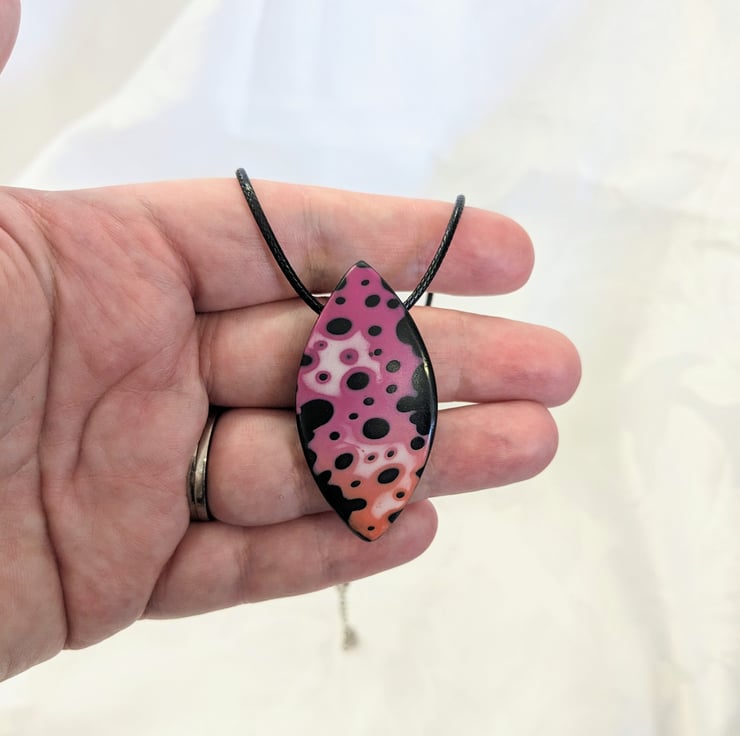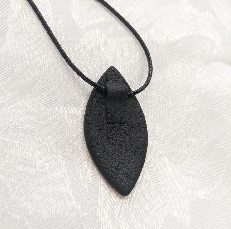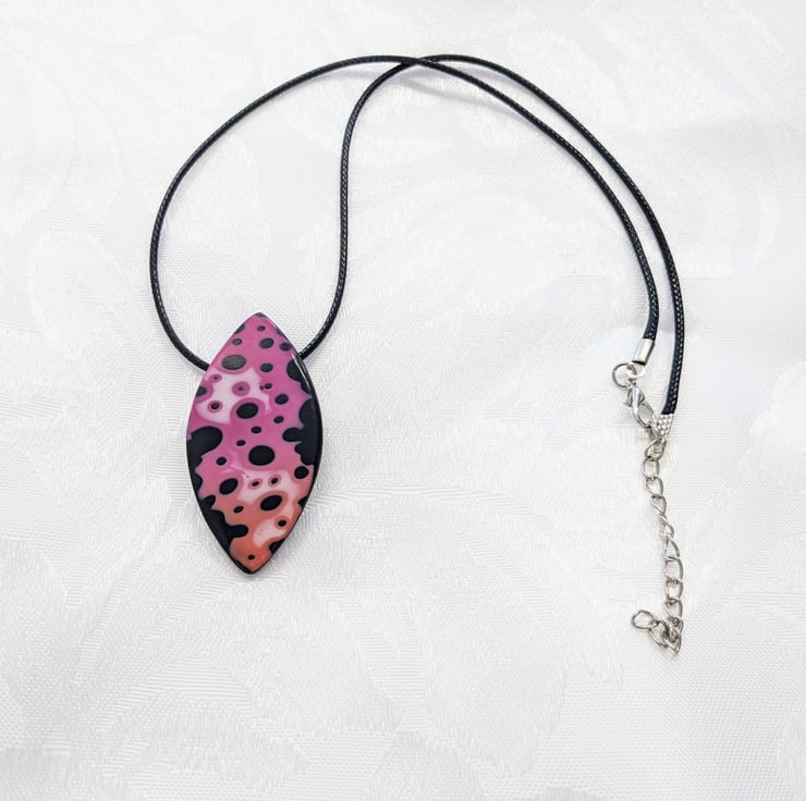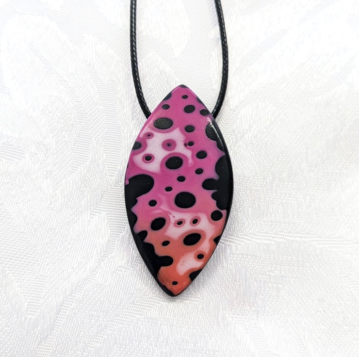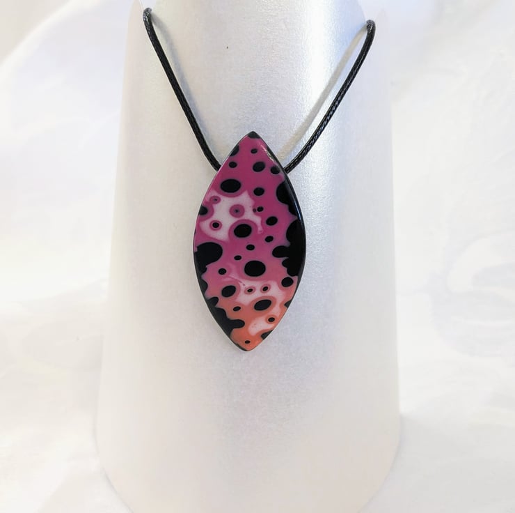Chunky pointed oval pendant, with pink fading into orange, over a black background. Backed with a textured black backing and integrated bail loop, wide enough for a range of different necklace cord thicknesses.