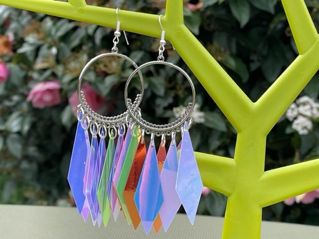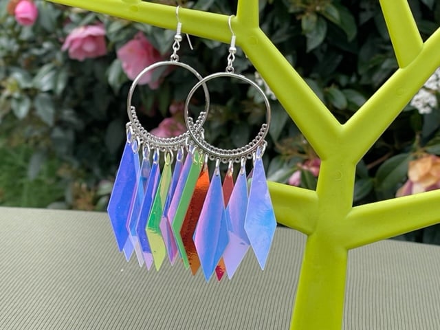 I've used arrow shaped holograph sequins. These are all the same pair of earrings, you can see how they change colour in the light. So beautiful and what a statement. I've paired them with silver plated round creole hoops and finished off with silver plated hypo allergenic ear wires.