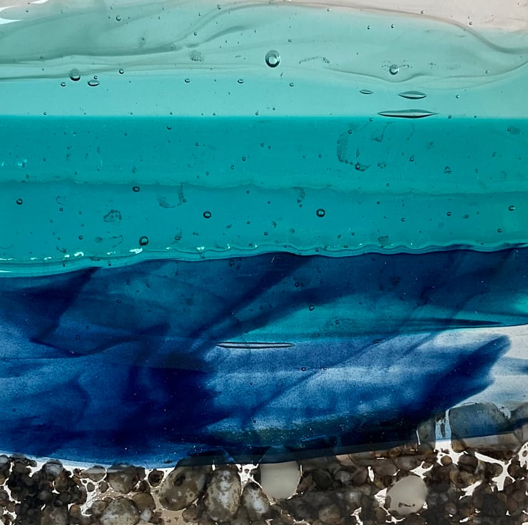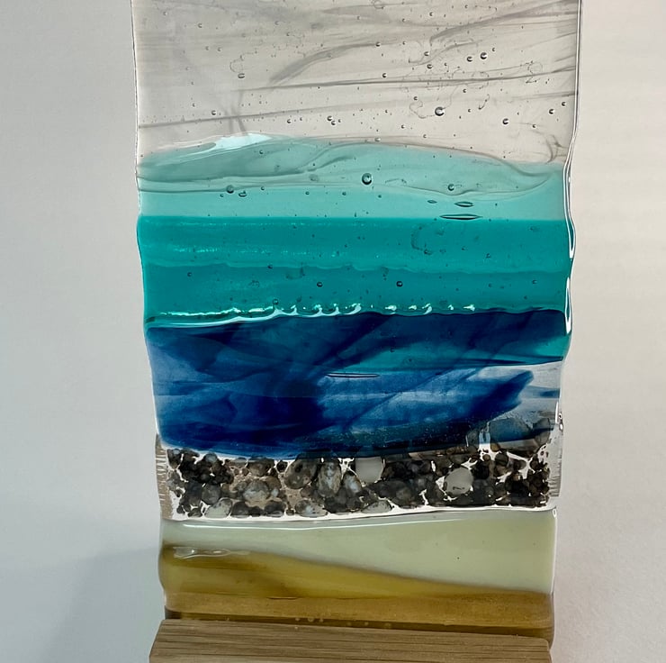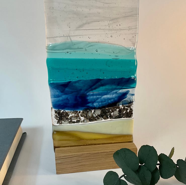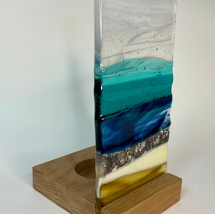 This is a unique handmade fused glass seascape, set into a solid oak base with a candle recess. It would make an ideal gift for a nature lover and comes to life when the light passes through the glass.