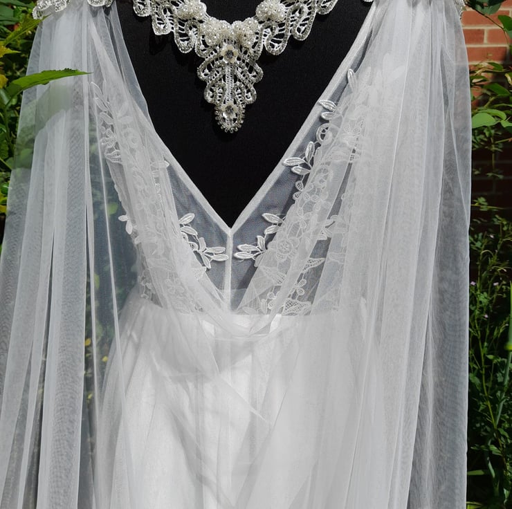 This cathedral-length off-white wedding cape for bride will become the statement piece of your special day. Crafted from luxurious tulle and decorated with sparkling applique at the shoulder part of this beautiful cape, this beautiful bridal accessory will bring timeless grace to your look.