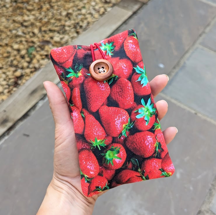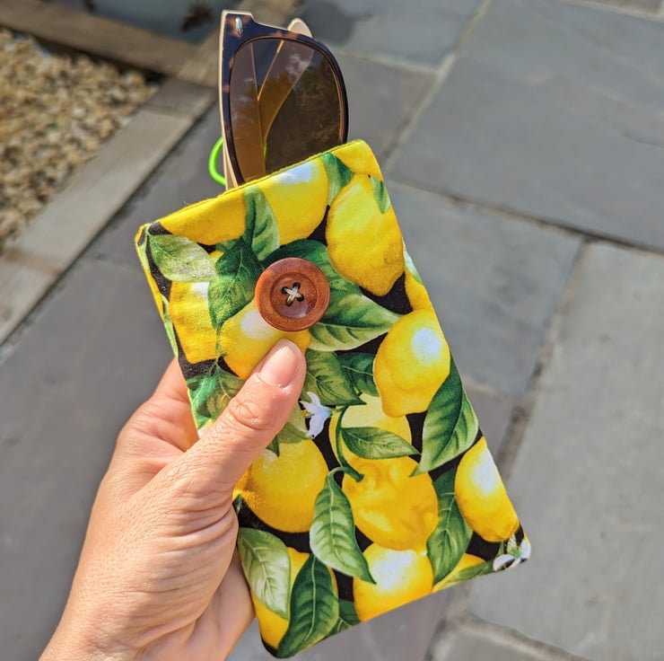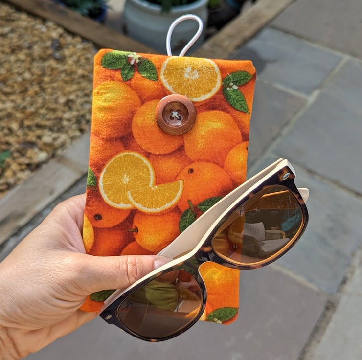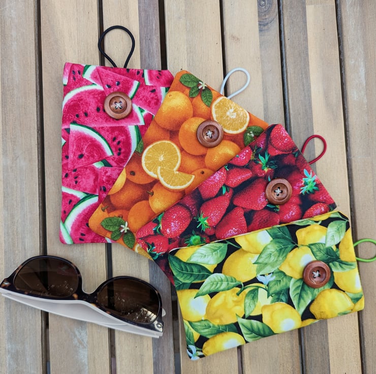 A padded glasses case, with secure elastic loop closure, in a fun summery fabric. Great for keeping your sunglasses or reading glasses while on your travels!