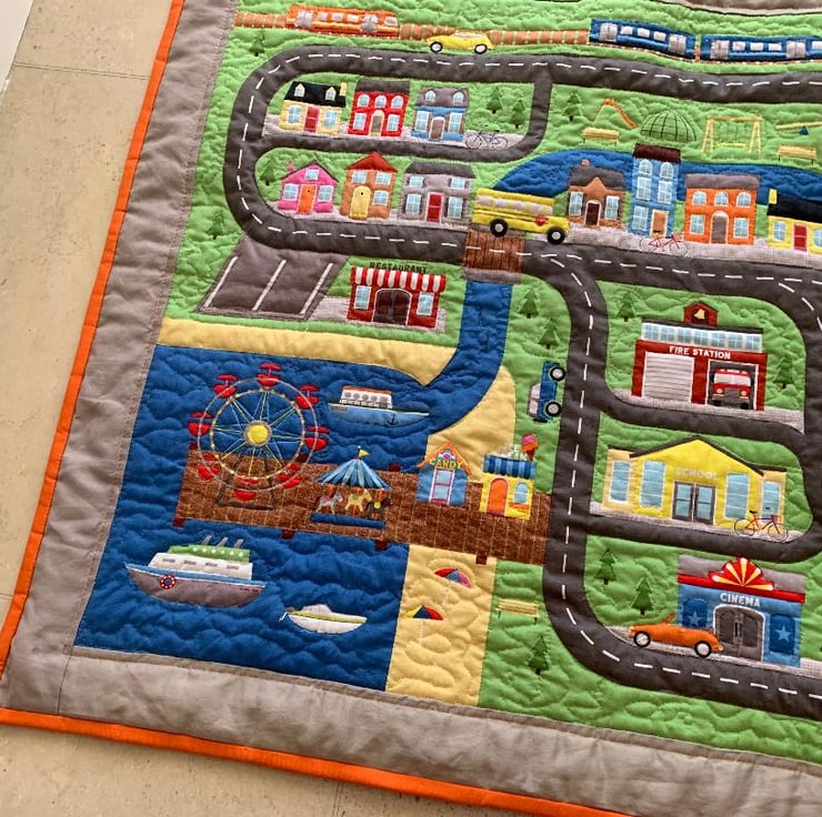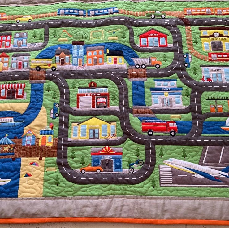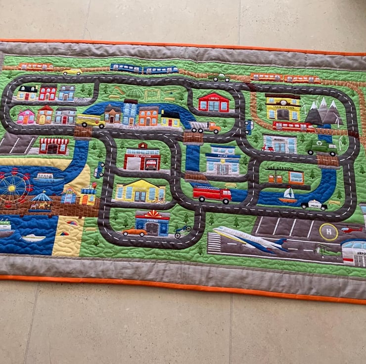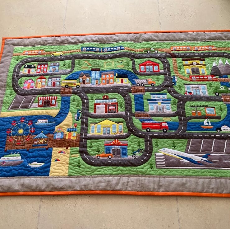 This is a very pretty quilted Toy Town Road play-mat, it has all the shops and roads that would be in a town, just right for boy's or girls to play with cars or dolls on.