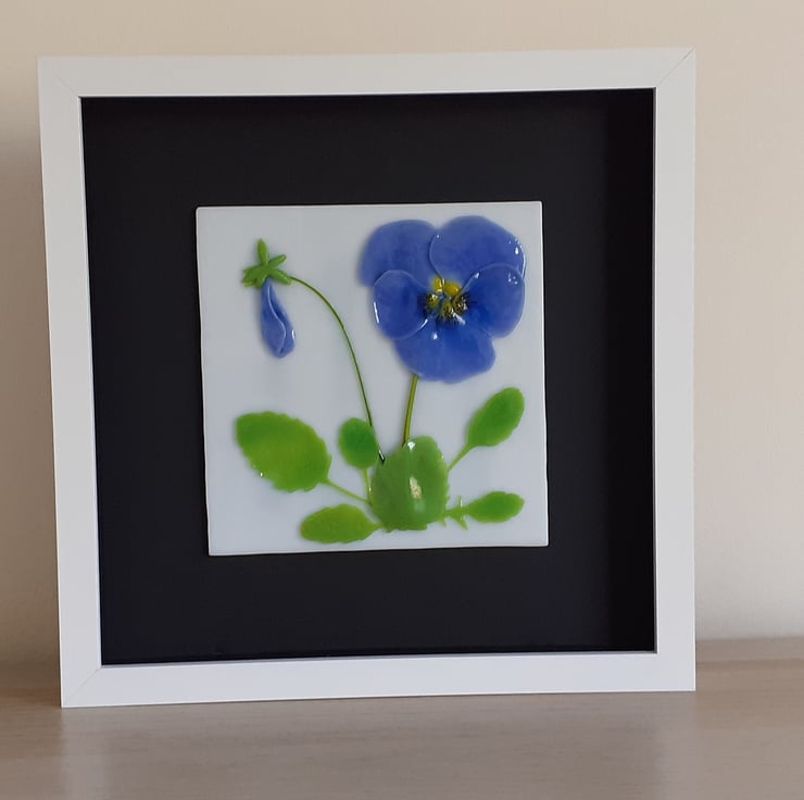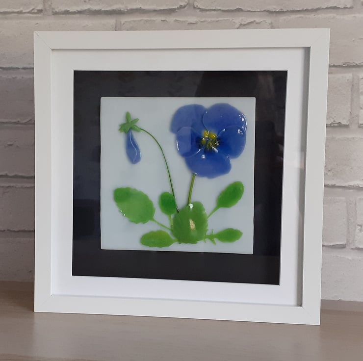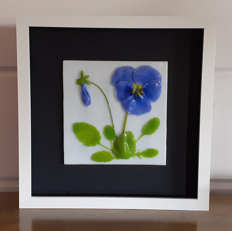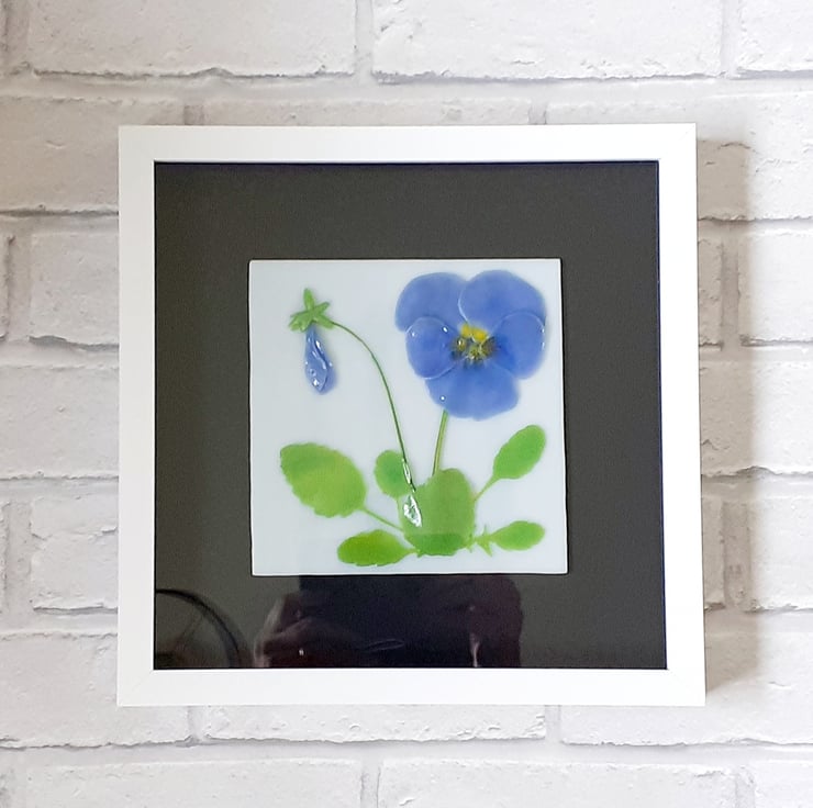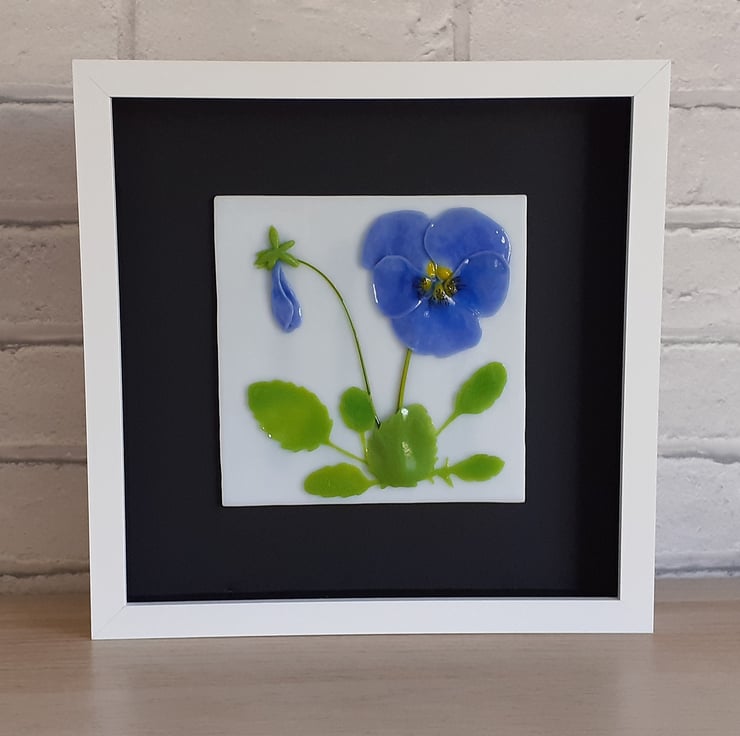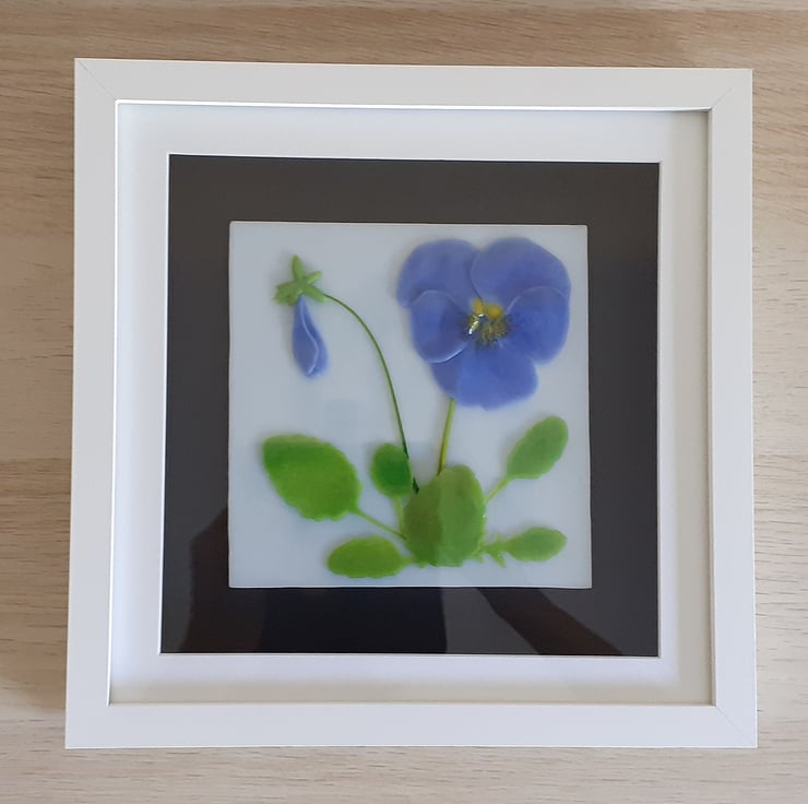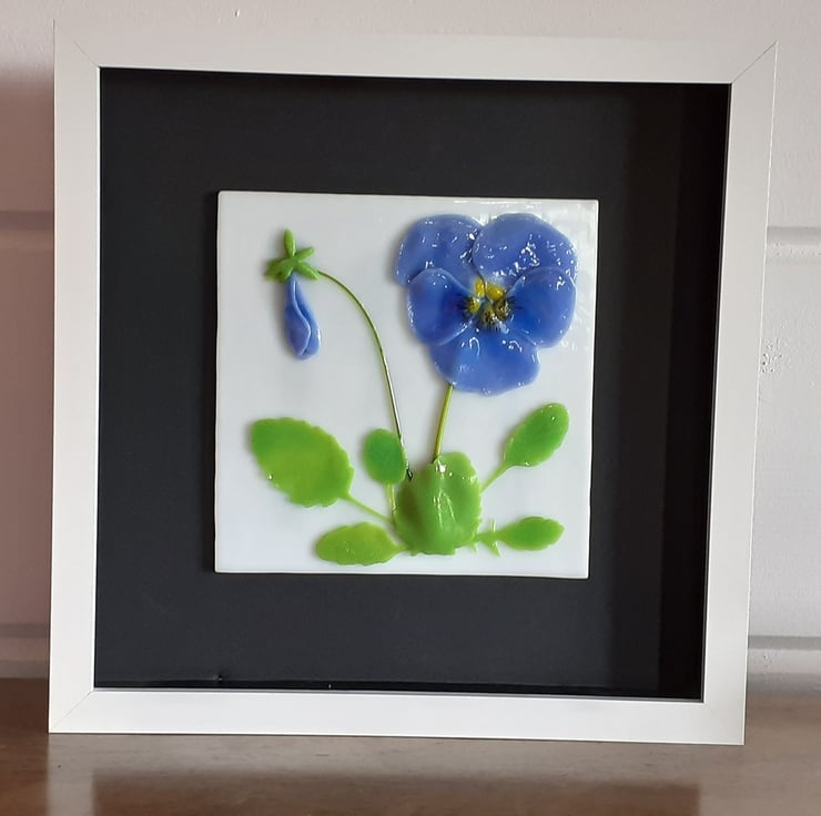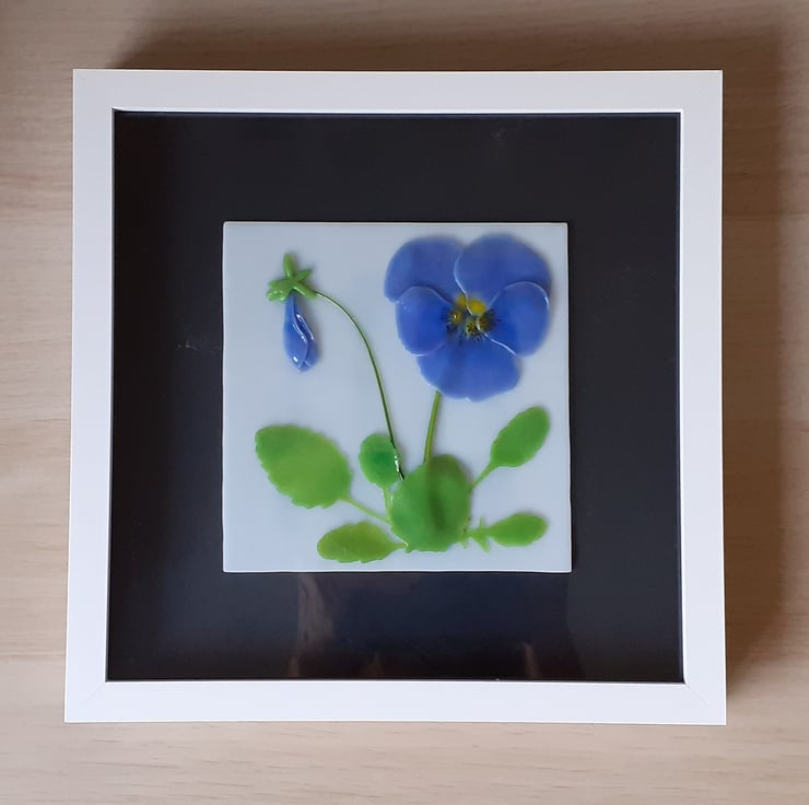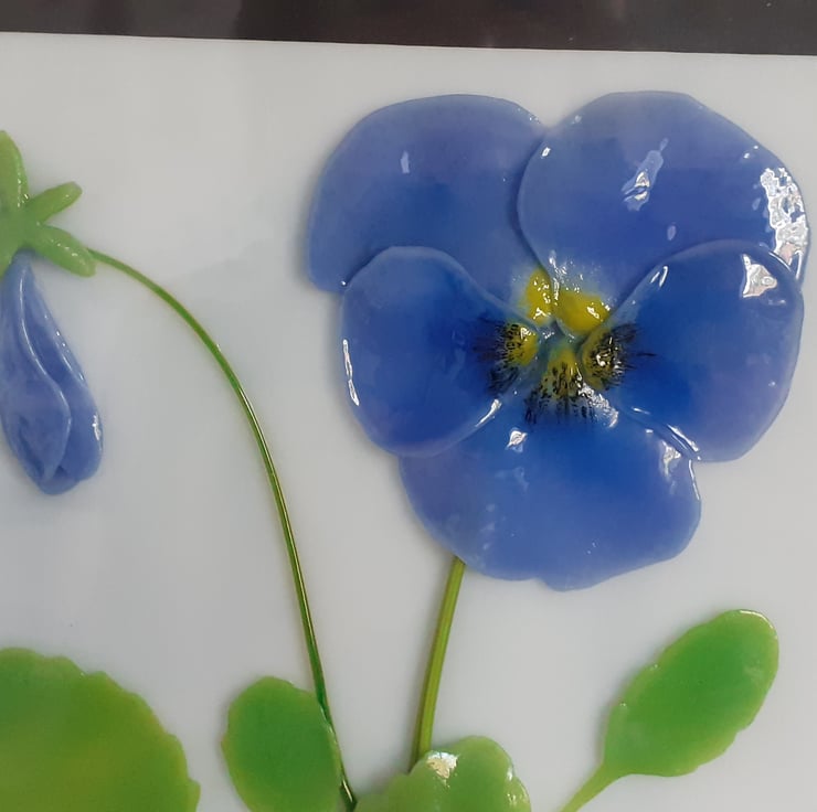 Created using coloured glass powders which are sieved through hand-cut stencils of individual petals and leaves. Several shades of powder are built up in layers to achieve a realistic colour. and the resulting 'wafers' are kiln-fused as separate elements to bind the powders together. The petals are then layered into flower heads and fused again, and finally the picture is built onto a base of white glass and the third firing takes place, resulting in a delicate and realistic 3D image.