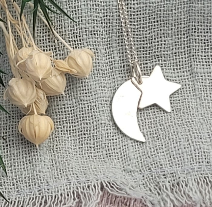 This lovely delicate necklace features a crescent moon that has been lightly textured with a little star added to a single jump ring that is then suspended from a sterling silver trace chain. The moon and star are handmade from sterling silver and measure 20mm ( 2cm).