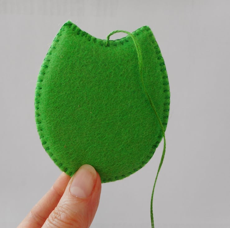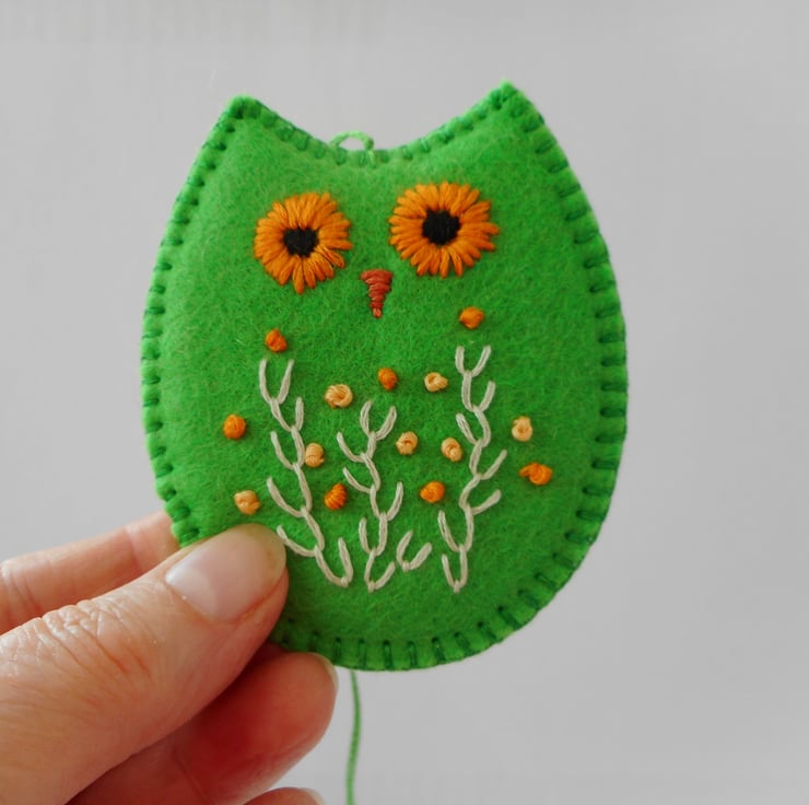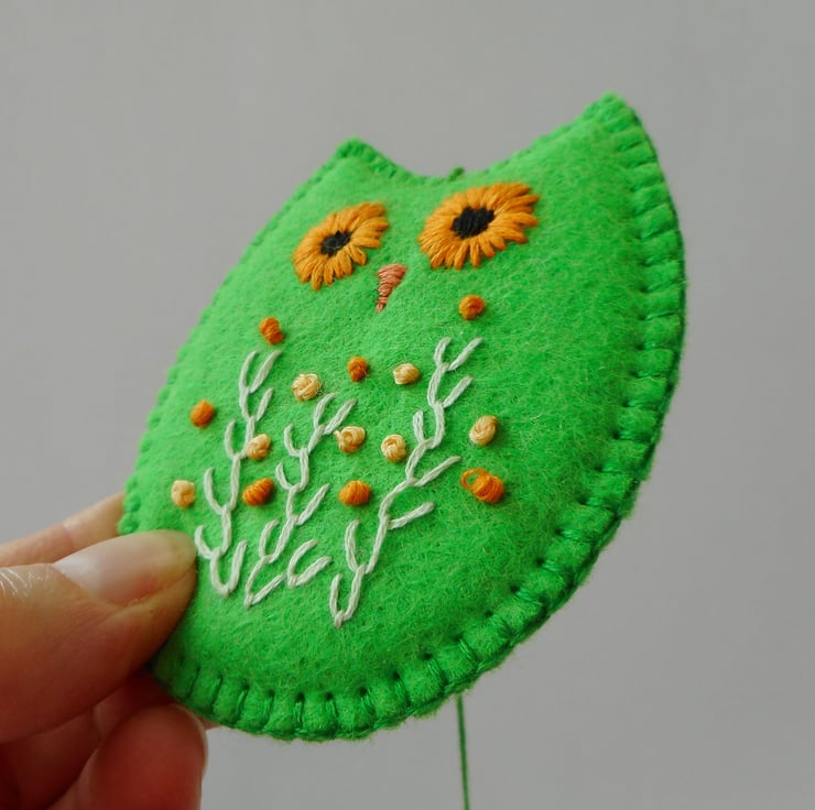 Made from felt in a bright green colour, this owl decoration has been completely hand sewn and embroidered with flowers. This is a very light ornament so will move beautifully in the slightest breeze.