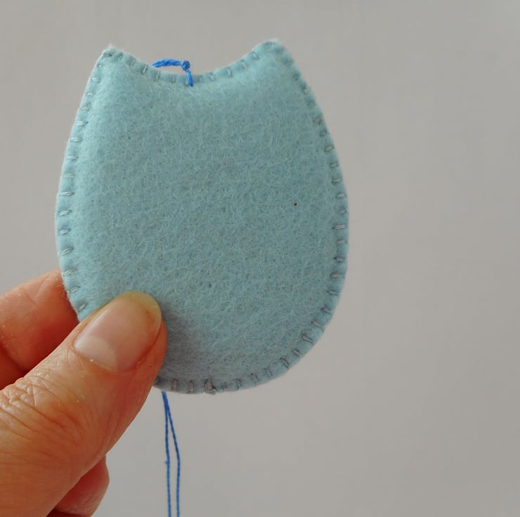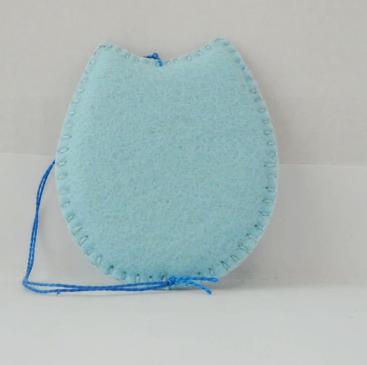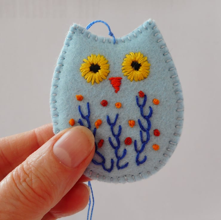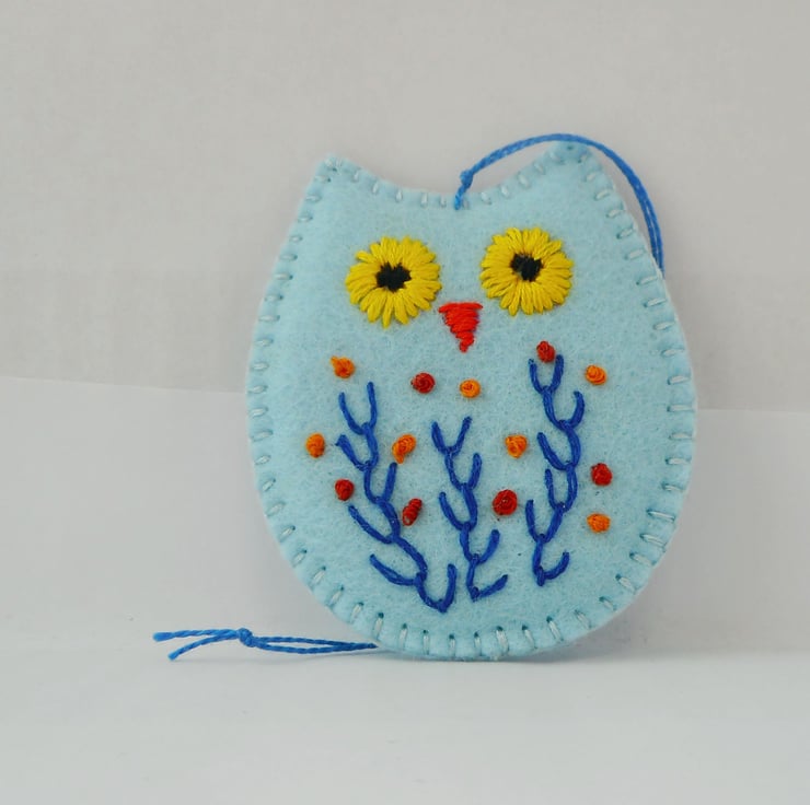 Made from felt in a pale blue colour, this small owl decoration has been completely hand sewn and embroidered with flowers. This is a very light ornament so will move beautifully in the slightest breeze.