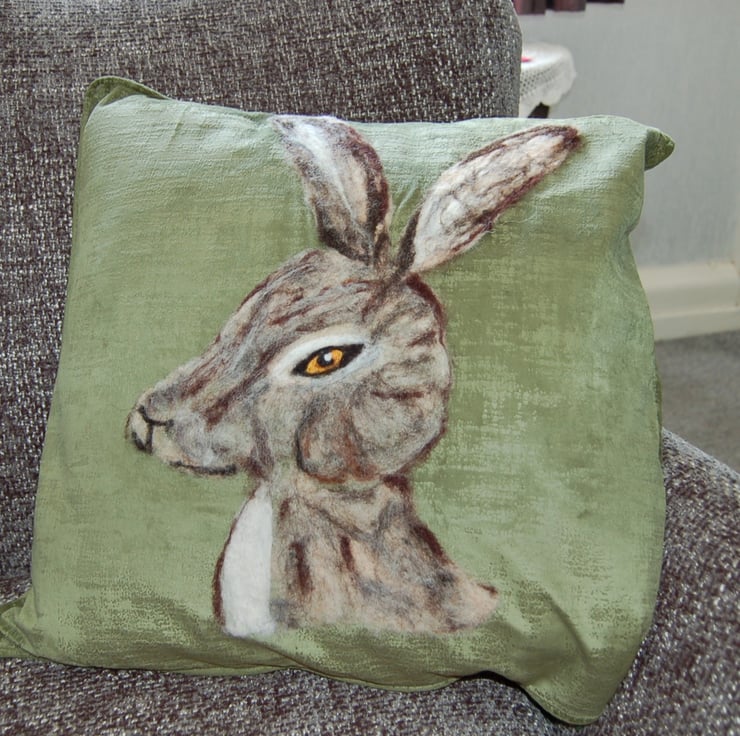The hare has been needle felted by hand using sheep wool fibres and a sharp needle. The finished cushion has been gently hand washed to help the fibres bind with the cushion fabric. The finished portrait is backed using iron on interfacing.