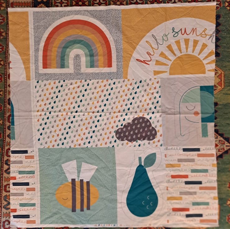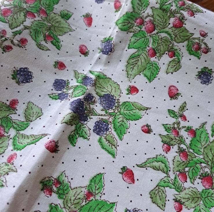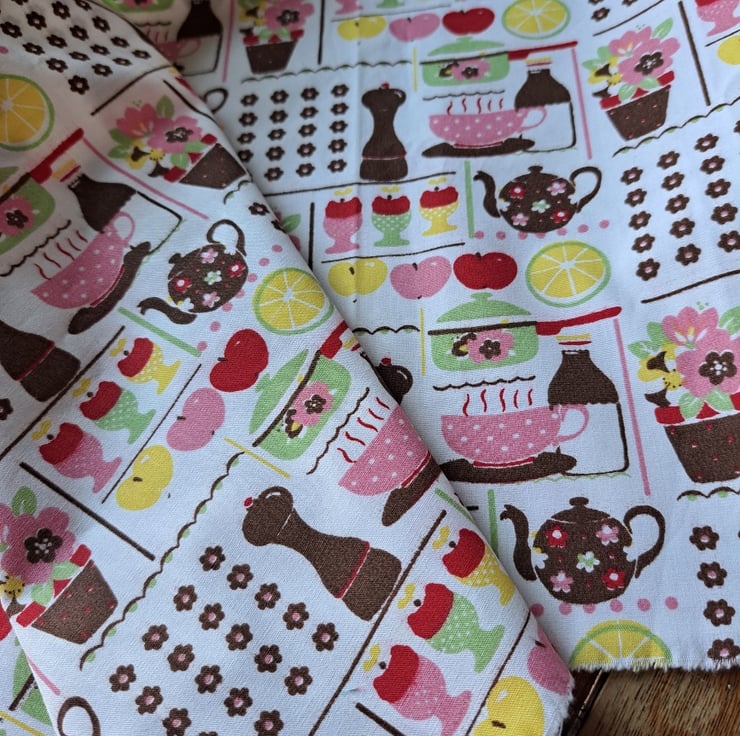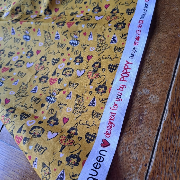 These are fabrics that bring a smile to your face - and they're big pieces, too, which is something else to smile about. The biggest piece - roughly a metre squared - is a slightly incomplete Hello Sunshine Panel by Dashwood Studios. Then there's an 82cm by 53cm piece of a good-quality cotton bought in Hungary featuring kitchen items. A stiffer white cotton with a design of strawberries and blackberries comes in at a decent 54cm by 67cm. The fun and vibrant piece of orange organic cotton is covered in doodles of hearts and girls and measures 27cm by 89cm. Finally, there's a smaller piece of quilting cotton with a very sweet dog pattern. What an upbeat bundle!