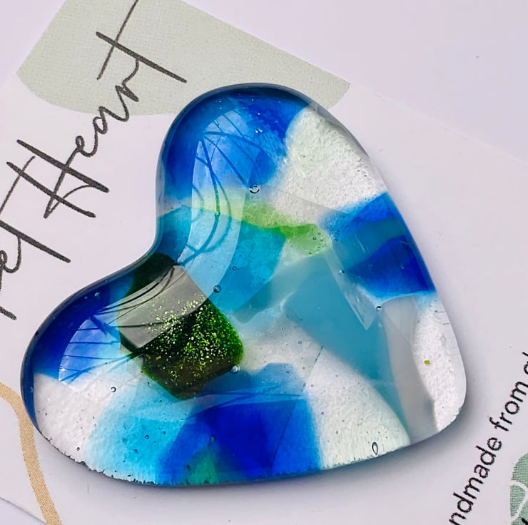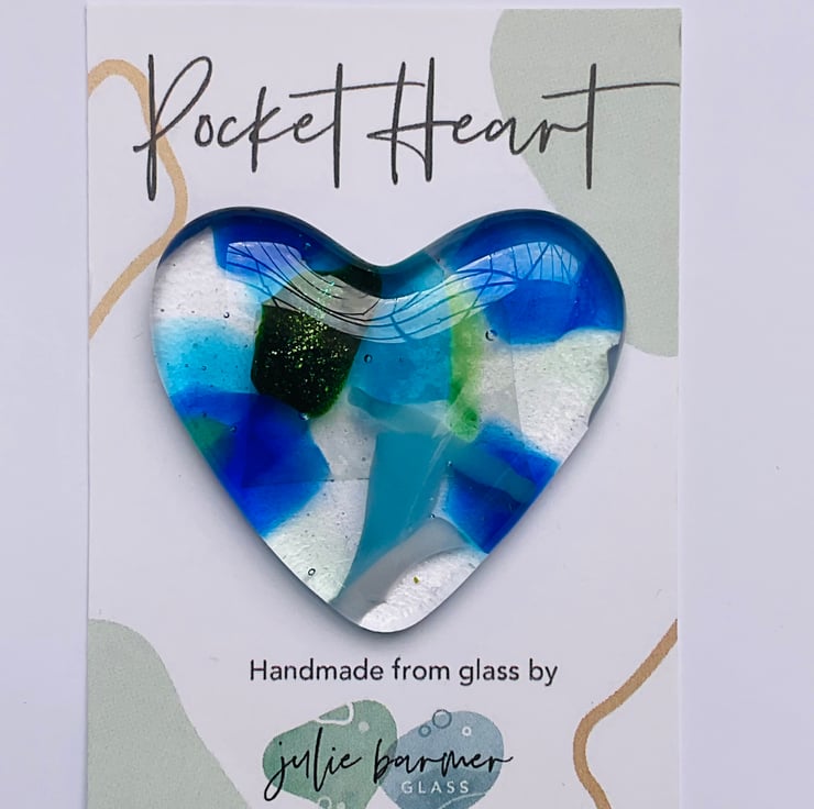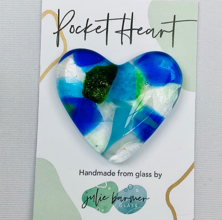 Handmade fused glass pocket heart, made from individual pieces of bullseye art glass. Due to the process each heart is unique.
