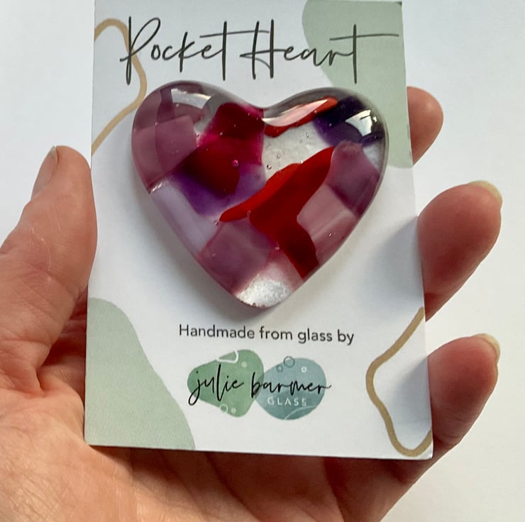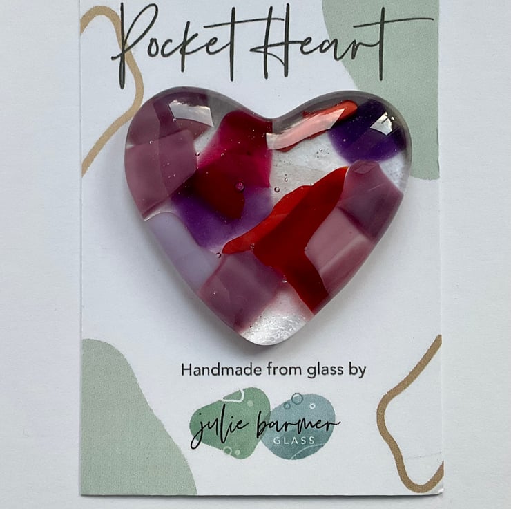 Handmade fused glass pocket heart, made from individual pieces of bullseye art glass. Due to the process each heart is unique.