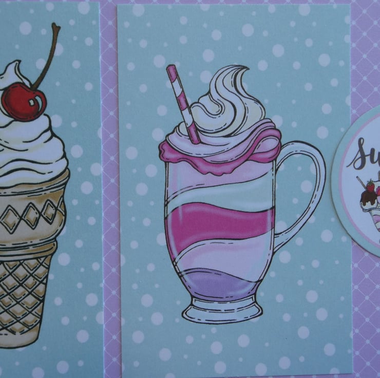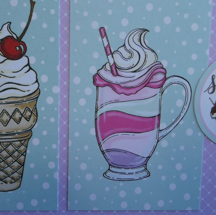 The card has two printed images of ice cream sundaes, one in a cone and one in a glass, in pastel shades of pink, cream and green.