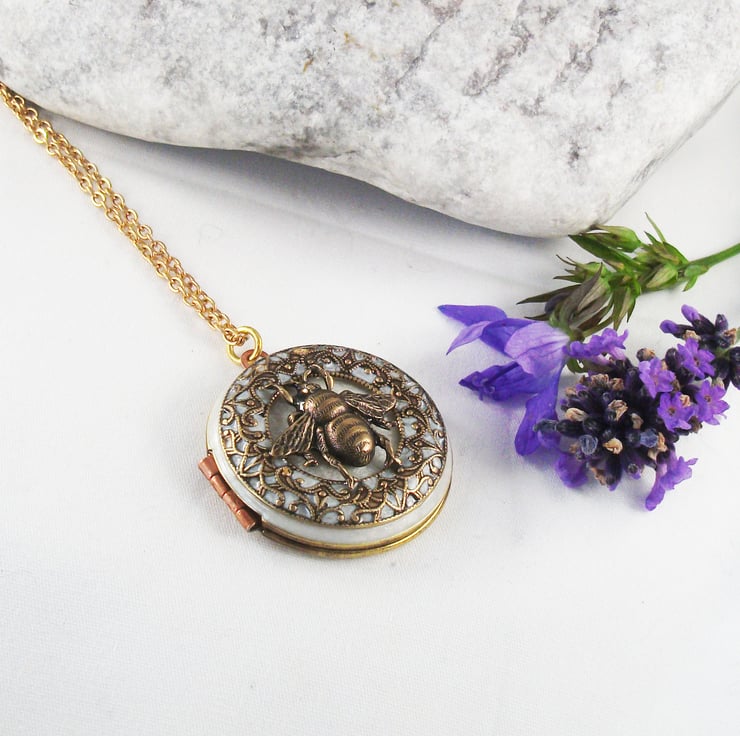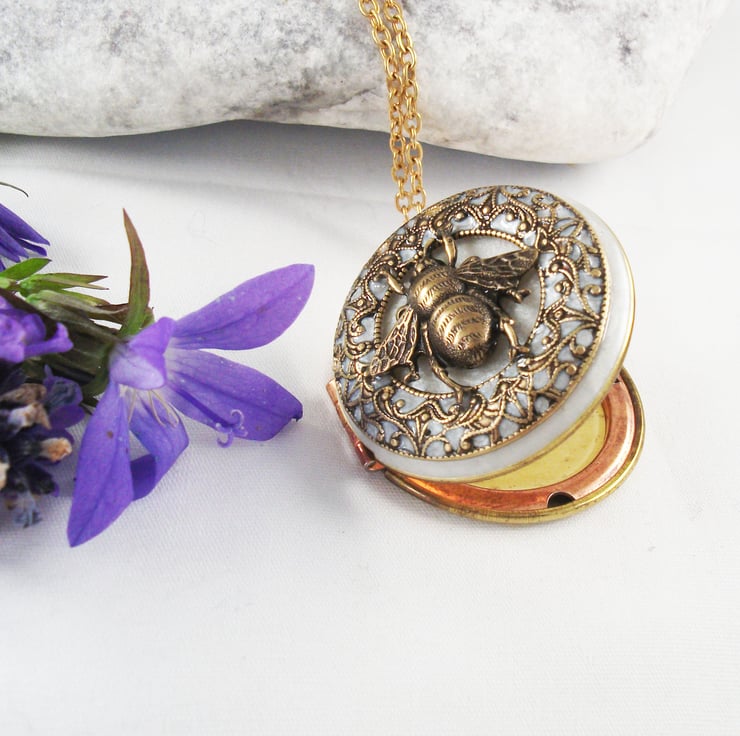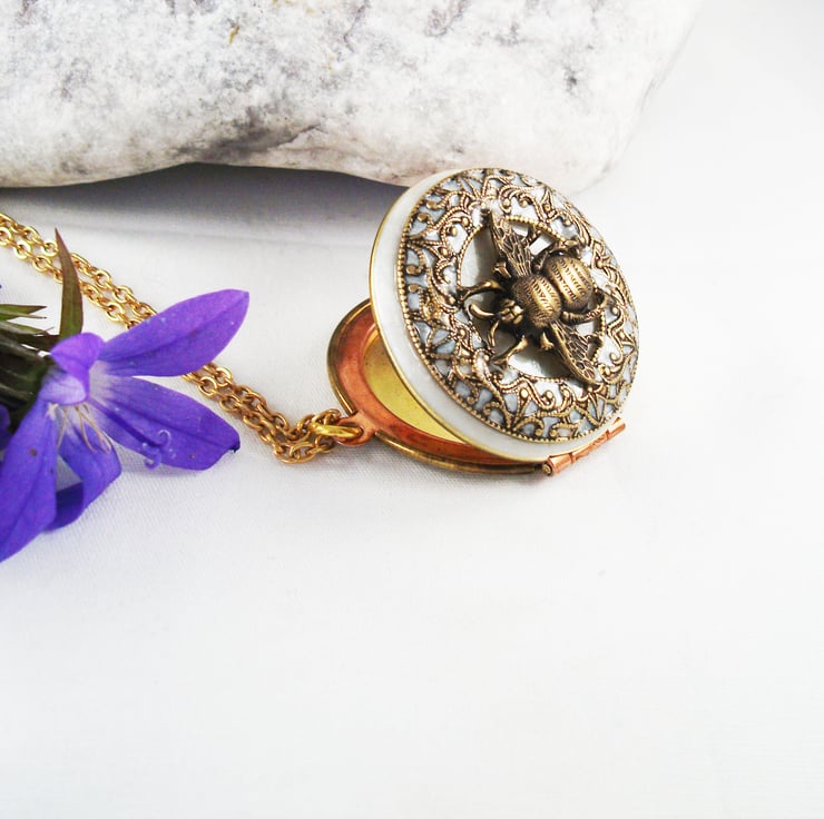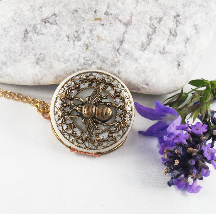 Pretty locket with a white cold enamel and brass bee to the front of the locket. Locket is hanging on a gold plated chain, please choose your length at checkout.