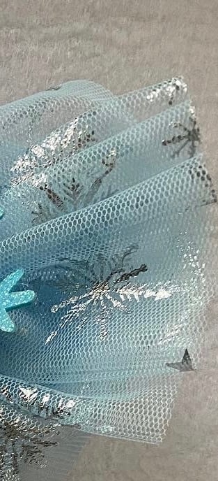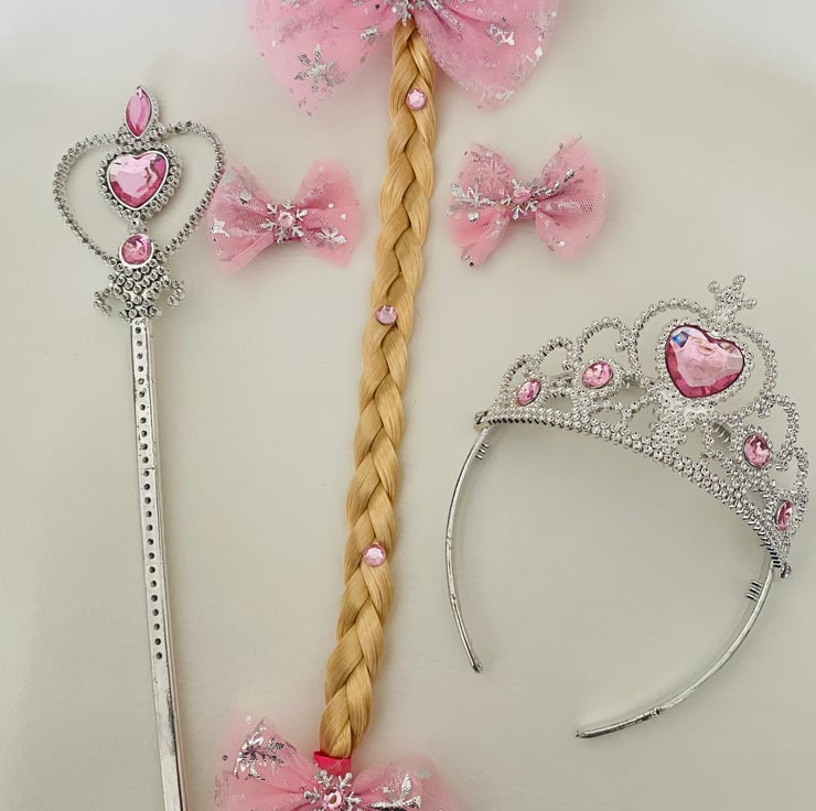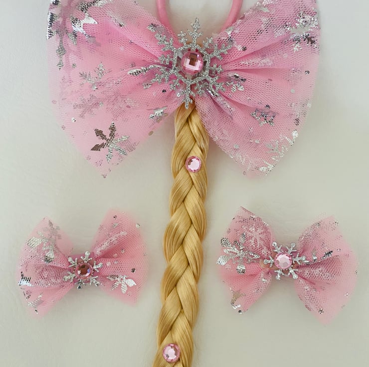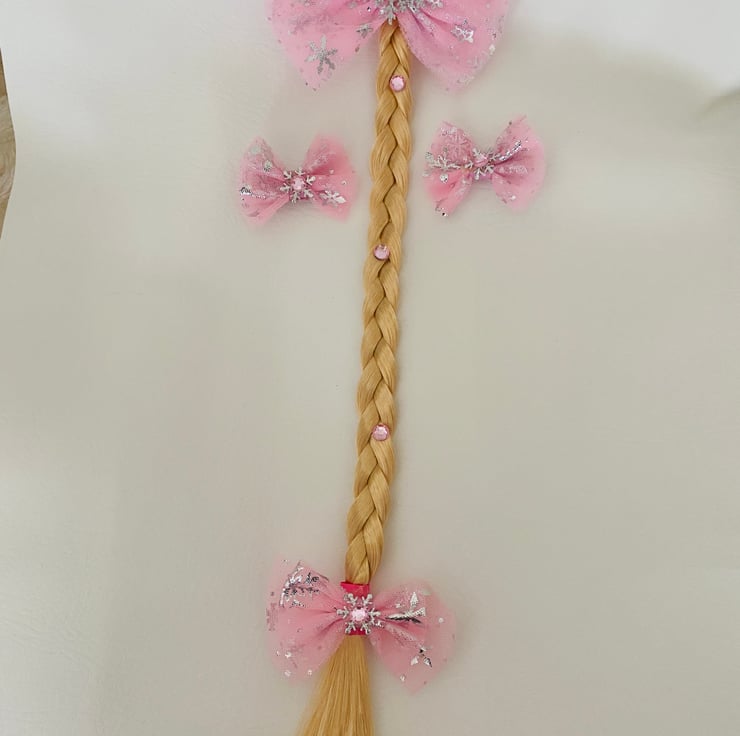 Handmade snowflake tulle bows on long plaited hair . Bobble measuring about 45 cms. Also can come with a pair of matching clips or wand and crown. In pink or blue