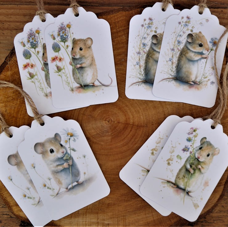 Pack of 8 cute gift tags. There are 4 designs, 2 of each - a sweet little mouse and flowers. There is a string attached to each tag.