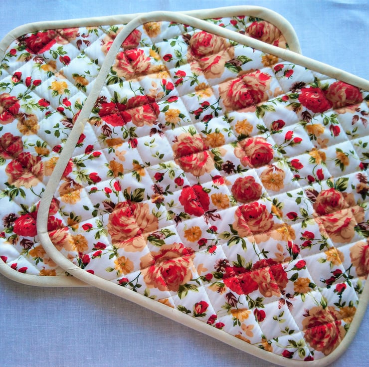 Placemat, Quilted Heat Resistant made in 100% Cotton Fabric, floral, in Red, Cream Rose Fabric. Good weight cotton fabric. They have 2 layers of heat resistant wadding inside each mat. The binding is handmade from the same fabric as the backing fabric (cream calico) and hand sewn on the reverse side. made to a very high standard. These scream out to me for Afternoon Tea Table!