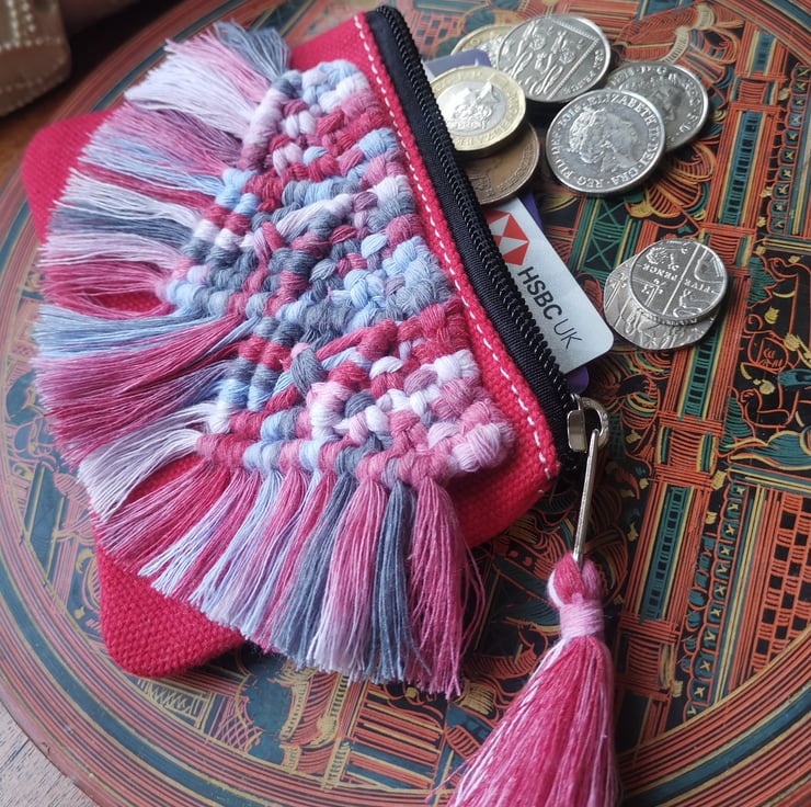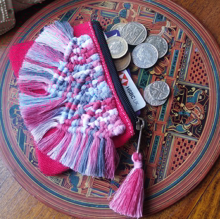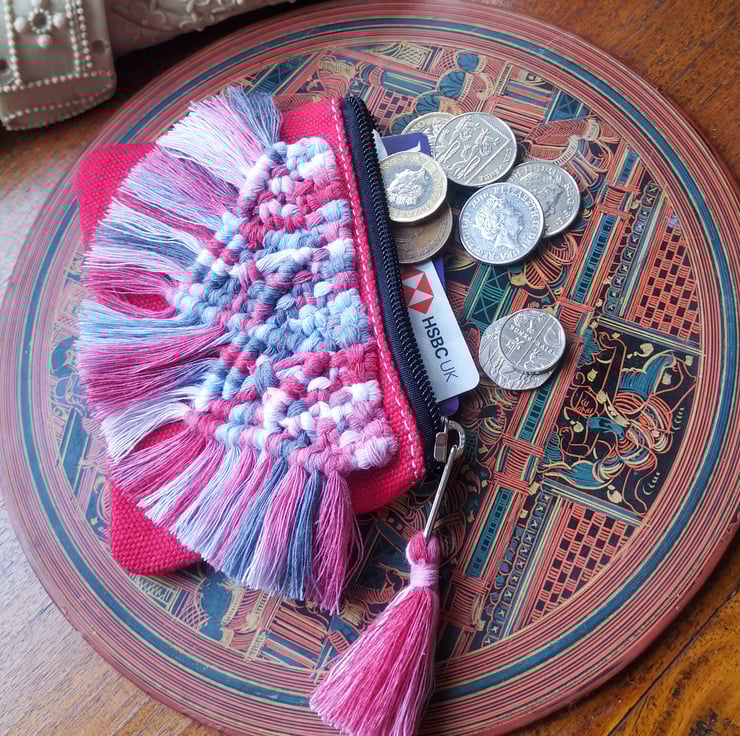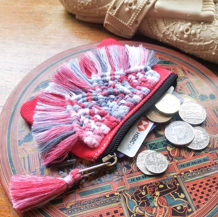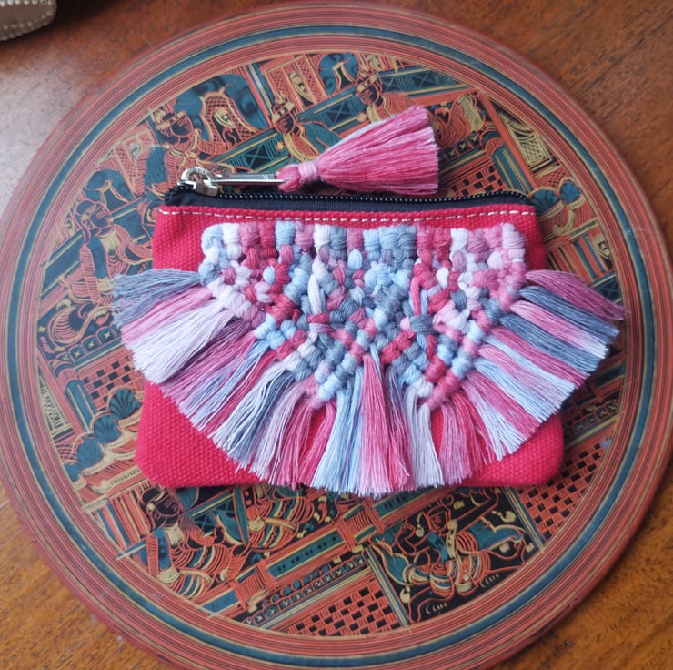 Cotton purse with a zip and tassel decorated with macrame cord.