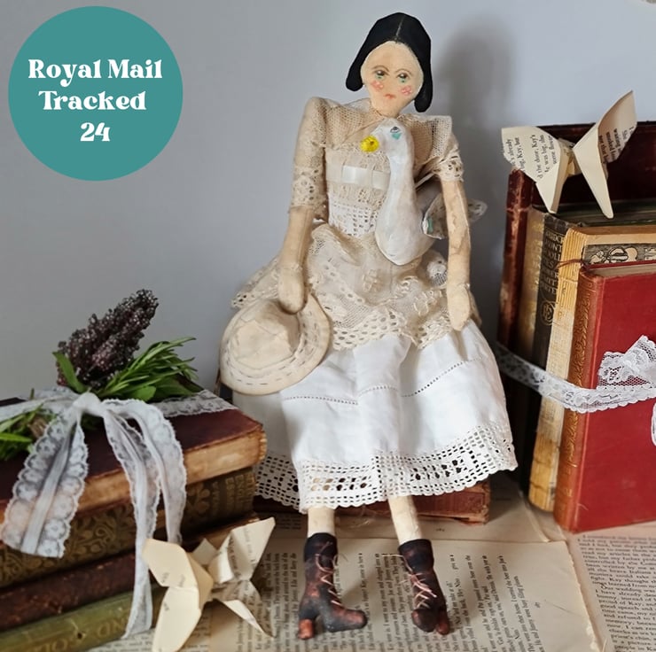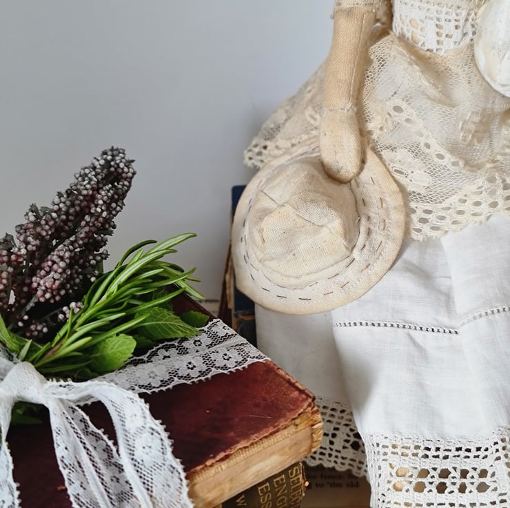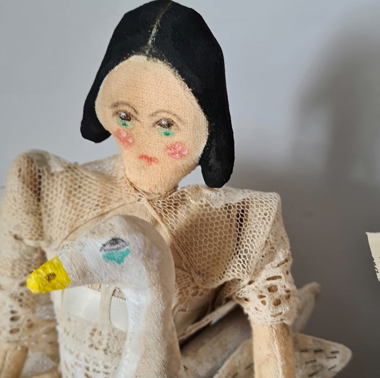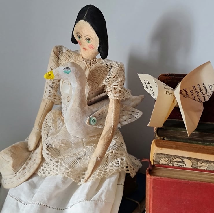 This quirky oringinal piece is hand and machine stitched, hand painted in unbleached cotton. Her dress is made from antique linen and lace purchased from one of the many vintage fairs i have visited. Her little hat, nad best friend goose have little running stitch embellishments.