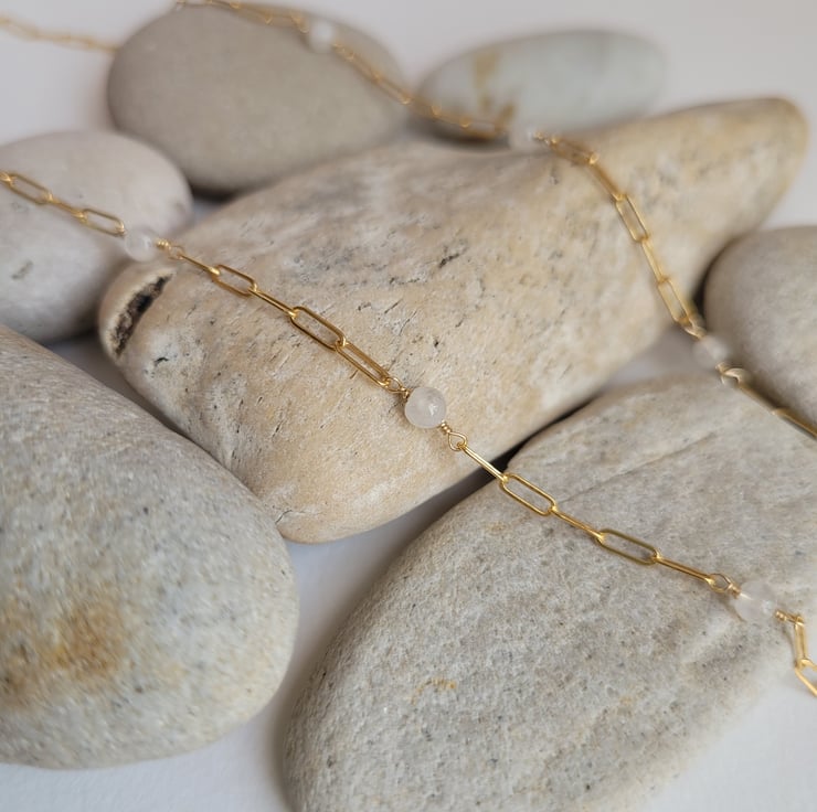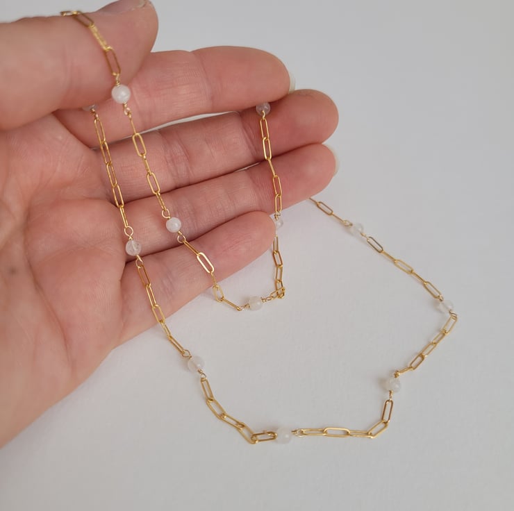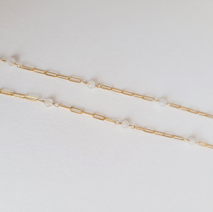 This necklace has been handmade by cutting equal lengths of 14ct gold filled chain and joining them back together by wire wrapping a small moonstone bead in the centre, to create a dainty elegant necklace.