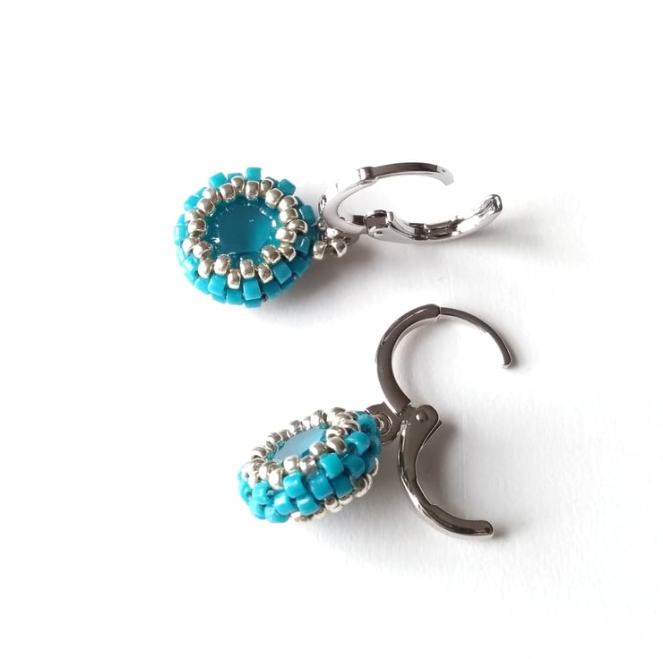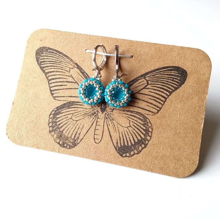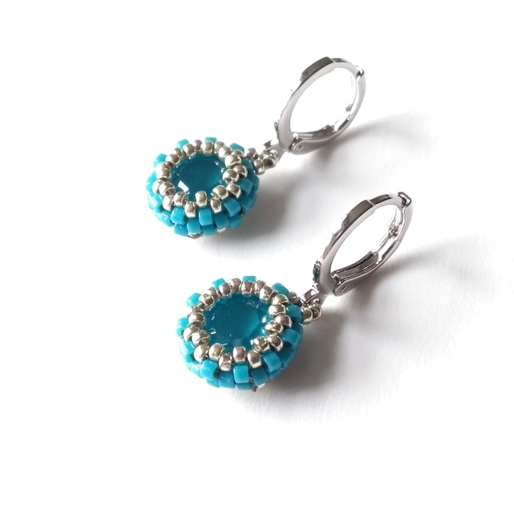This dainty pair features a beautiful Austrian-made 8mm chaton (the centre) in azure blue - a lovely opaque summer blue - encased in matching blue and silver seed beads. The drops have been strung directly on to a platinum-plated lever back round earrings, making them nice and secure. The lever backs are hinged for easy-open, easy-close - see photo. Also available in raspberry pink; see separate listing.
