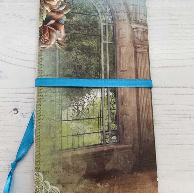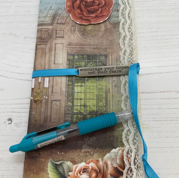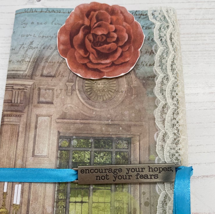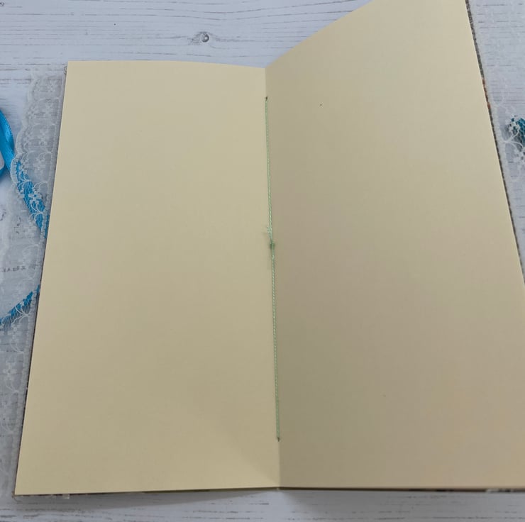 Beautiful paper covers both the inside and out of this journal, stitched around the edges with lace applies by a zig zag machine stitch on the front and back edge.