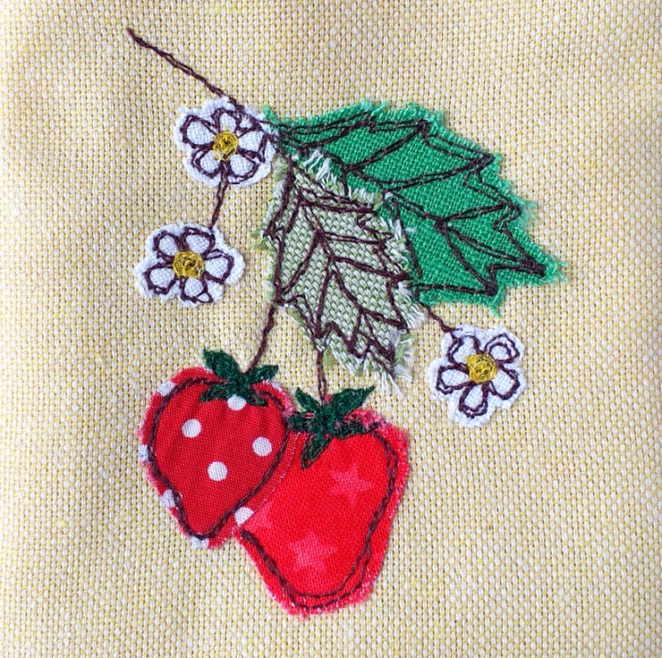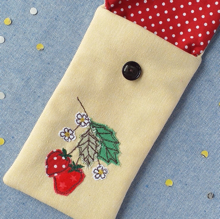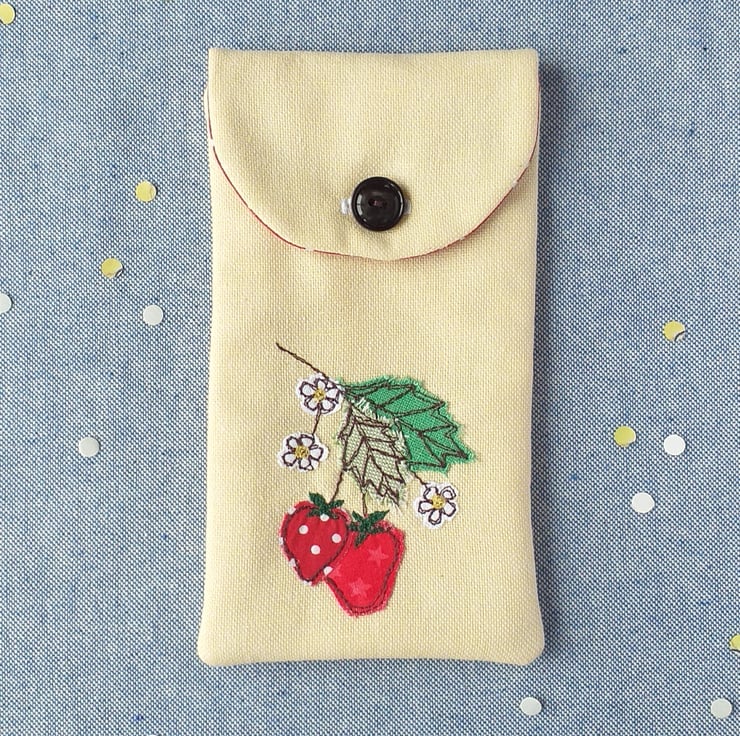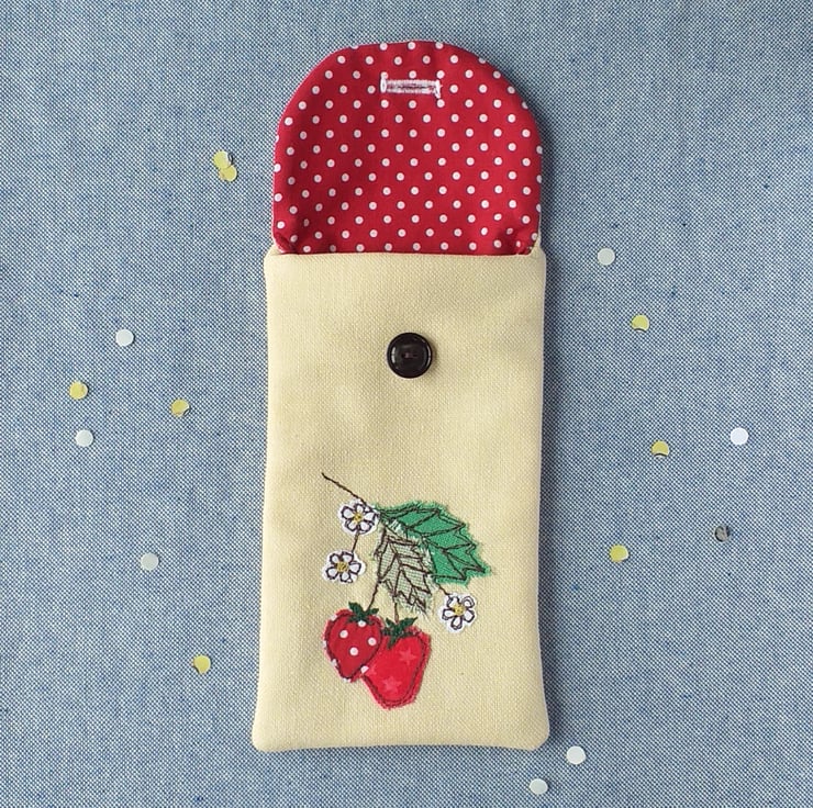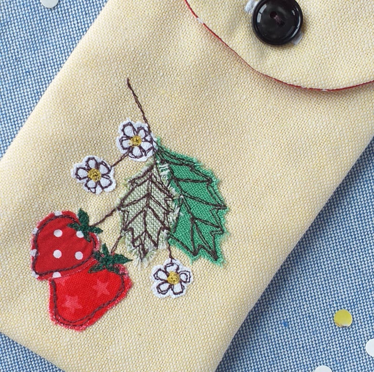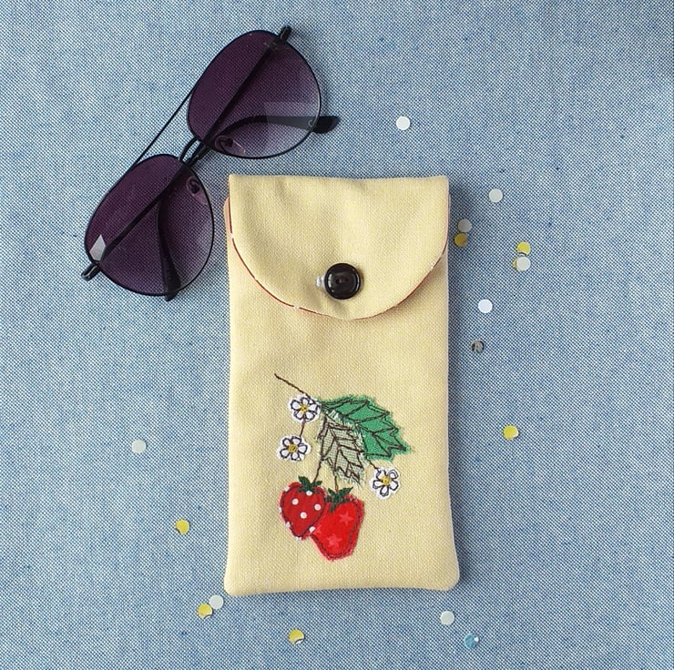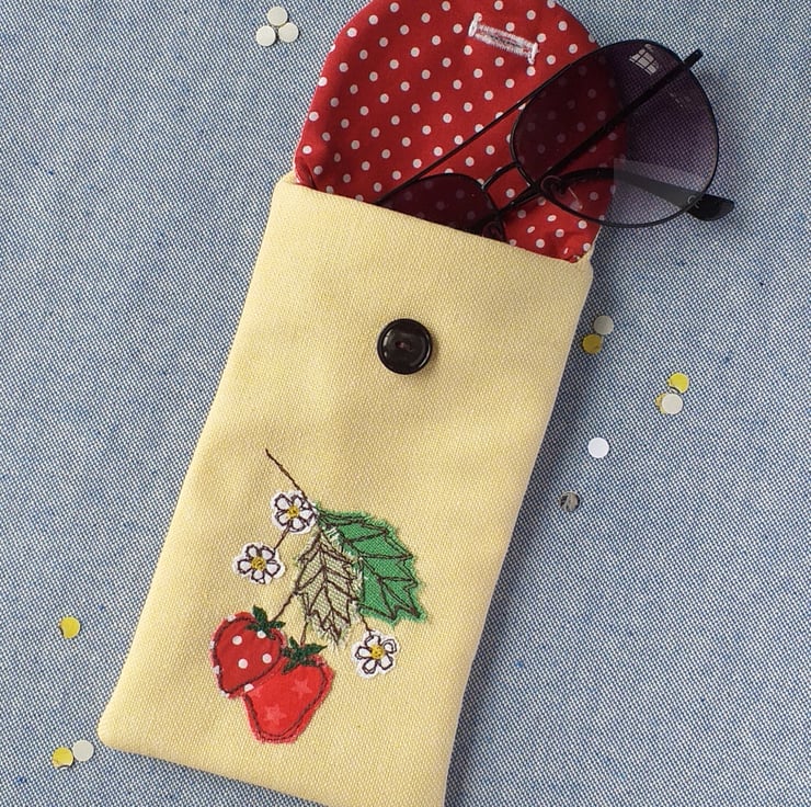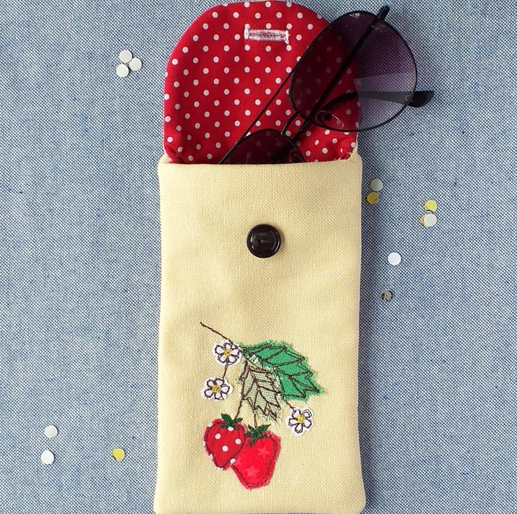 A summery glasses case, perfect for sunglasses or reading glasses. This is a soft but slightly padded case with a strawberry design made by appliqueing scraps of fabric onto a beautiful pale yellow linen, and stitching them using free motion embroidery. It is lined with a red spotty cotton fabric and has a button down flap. The case measures approximately 9.5cm wide and 18cm high.