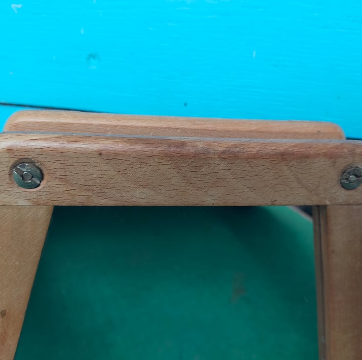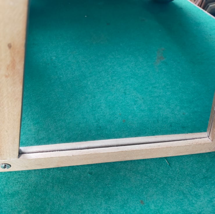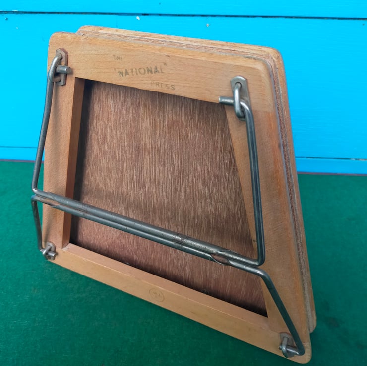 The "National" tennis press seems to have found another way to clamp a tennis racket, this time by means of pressing the rear levers towards the frame. Nonetheless, it makes for an interesting decorative feature. The mirror is backed in plywood this time to give the freestanding mirror extra stability. Waxed finish. H230mm x W280mm x D75mm.