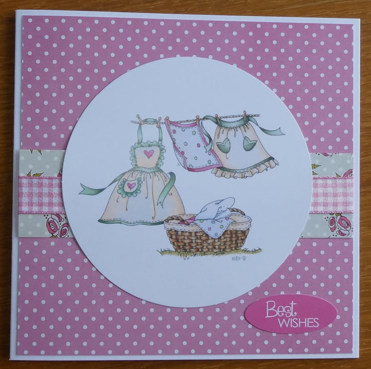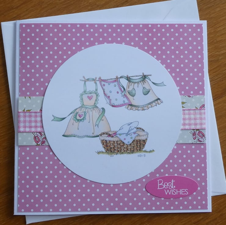 With it's image of washing drying on a line in pastel shades of green, pink and cream and the greeting Best Wishes this card would be great as a new home, birthday or retirement card.