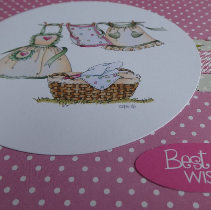 The front of the card has a central circular printed image of a retro style washing line with 2 pinnies blowing dry in the breeze. Underneath the washing line is a wicker washing basket with more washing.