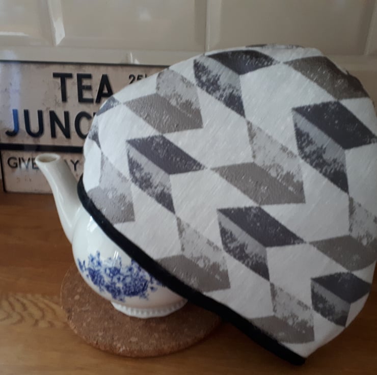 medium size, Padded and fully lined, made with a grey and black geometric pattern.