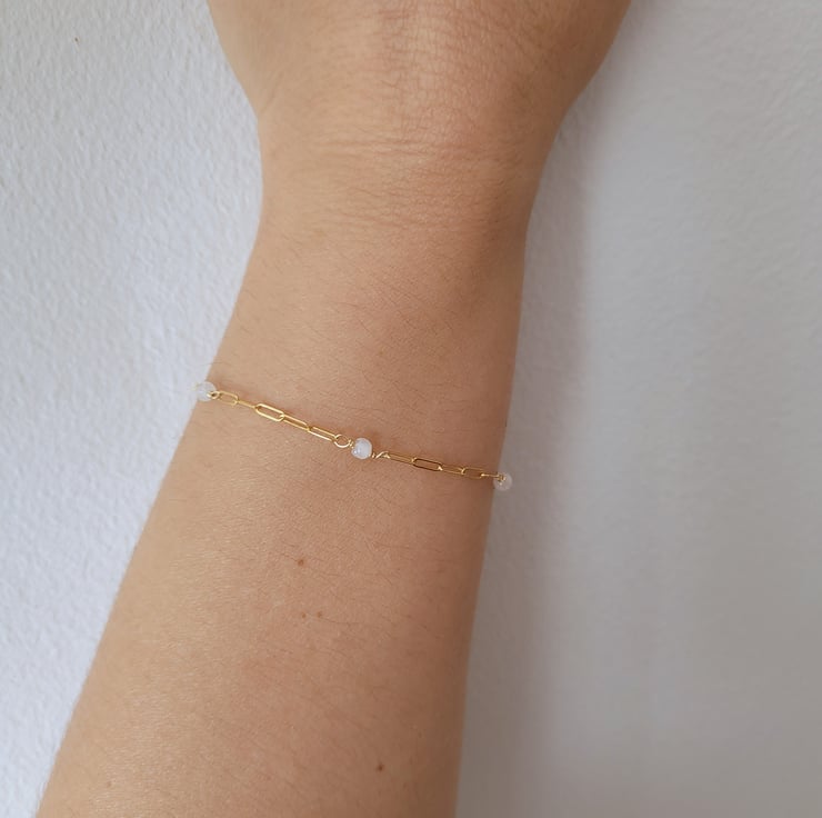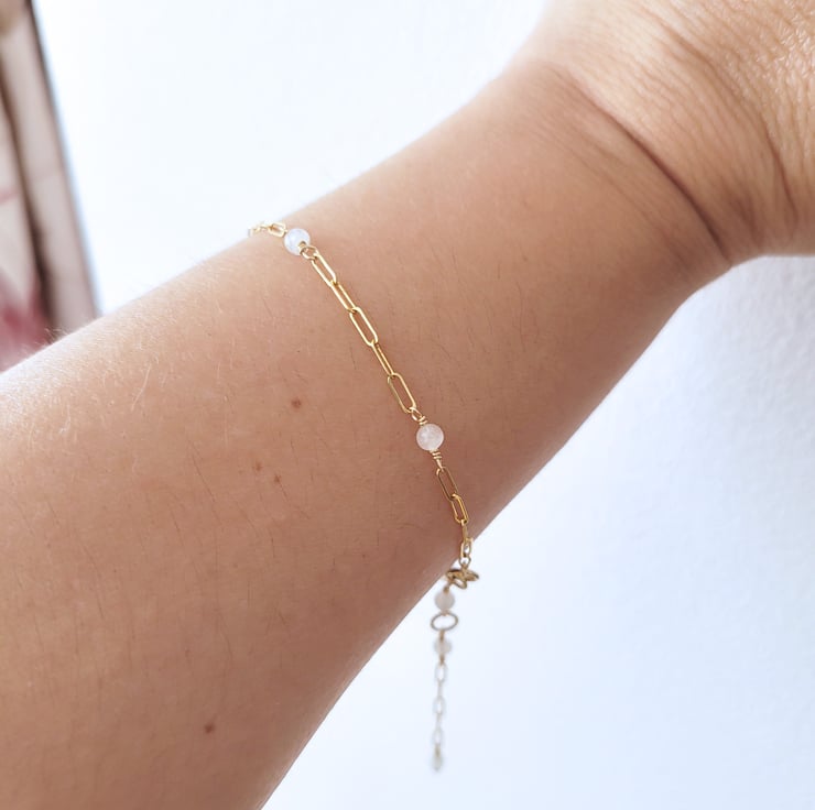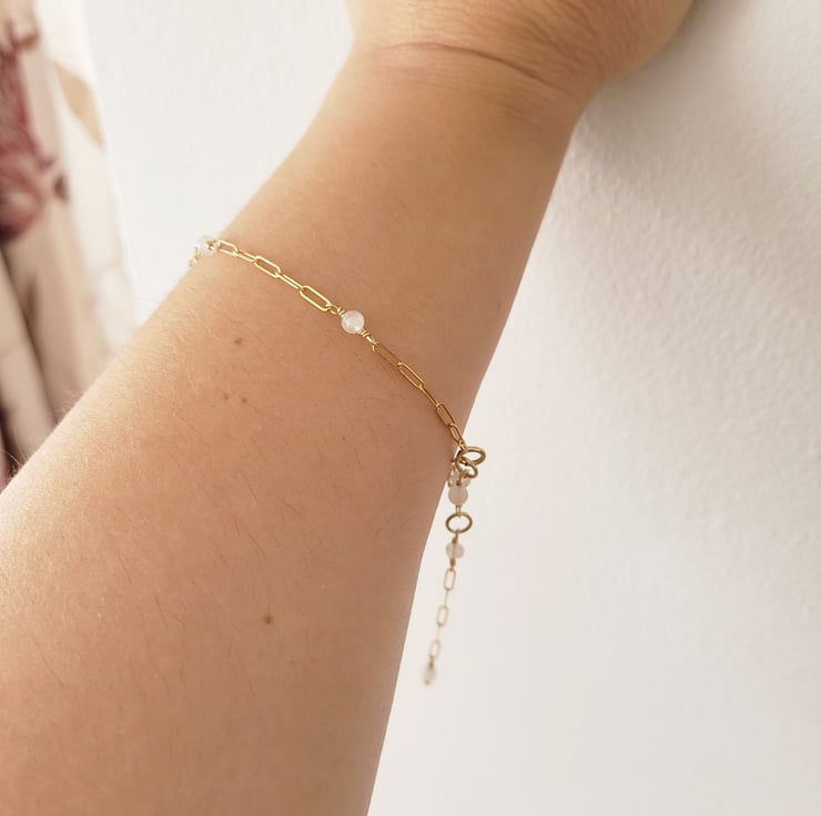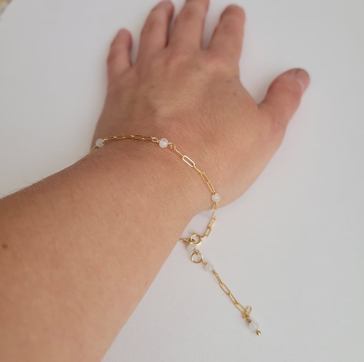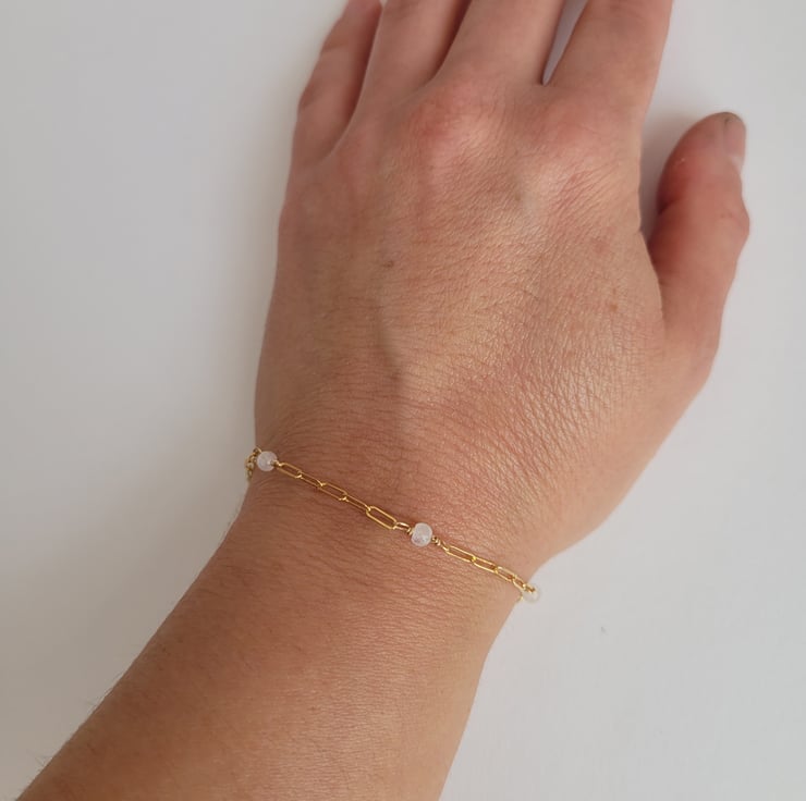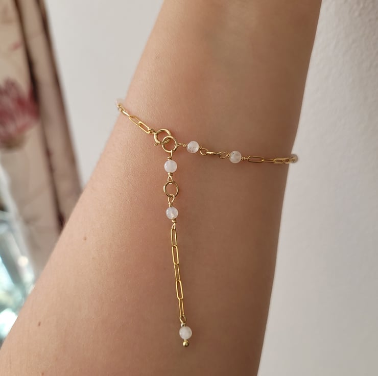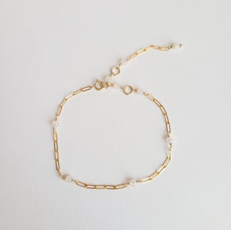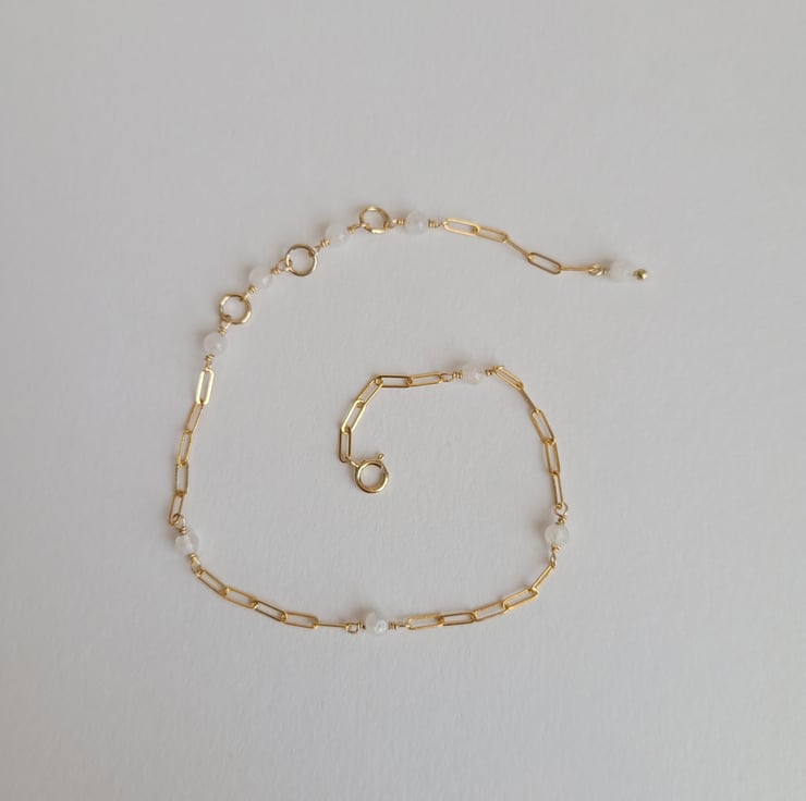 Handmade moonstone bead and 14ct gold filled wire wrapped and 14ct gold filled paperclip chain, dainty bracelet. After the fastening rings there is a little gold chain and moonstone bead tail to add a little extra glamour.