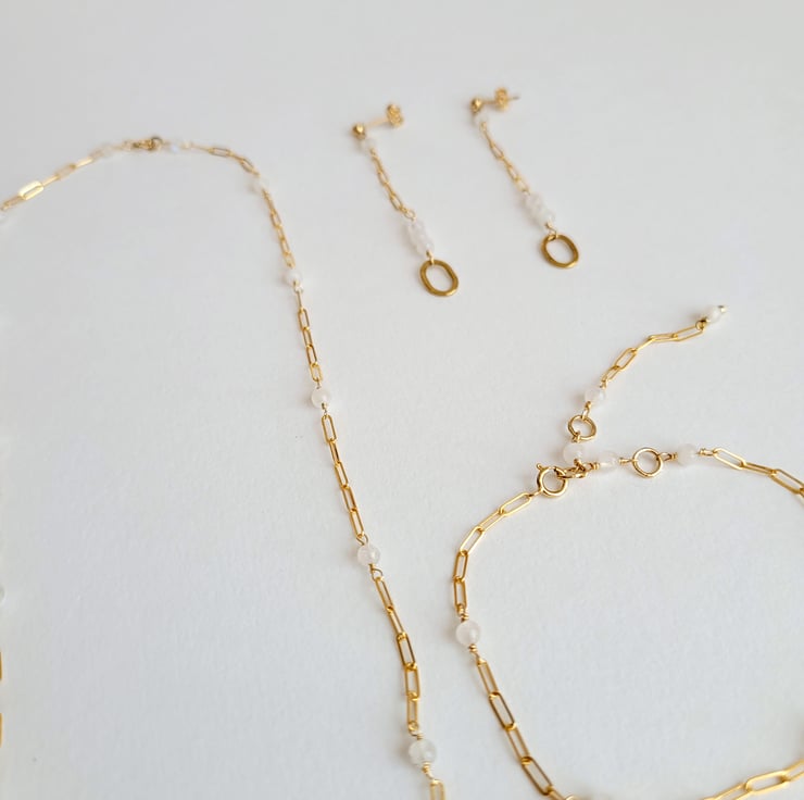The moonstone beads are natural semi-precious moonstone beads, not glass. Each bead is individual and measures 3mm across in diameter.