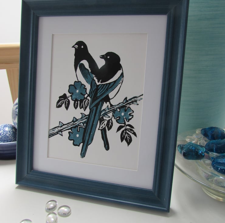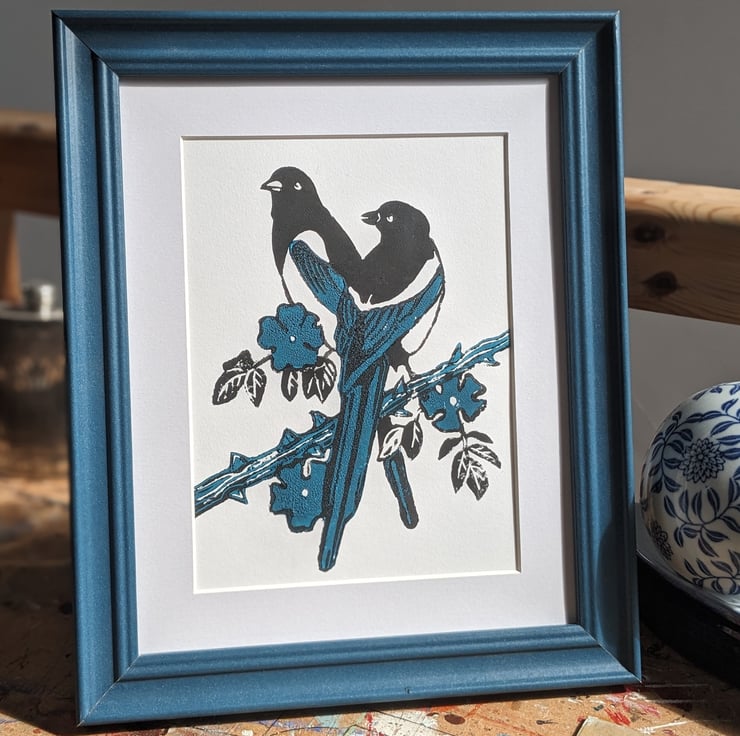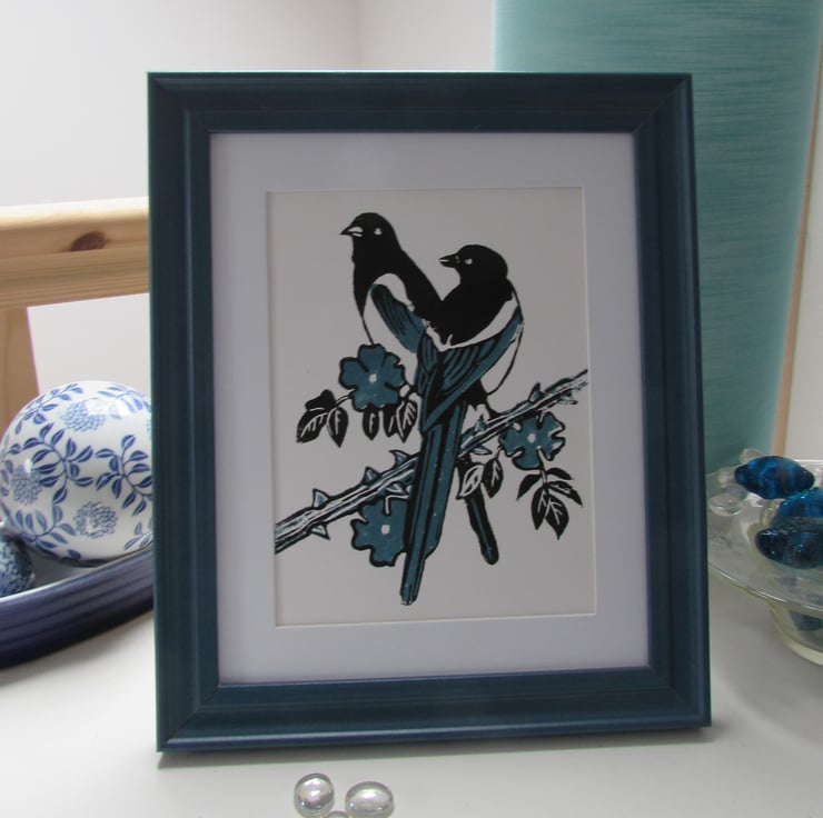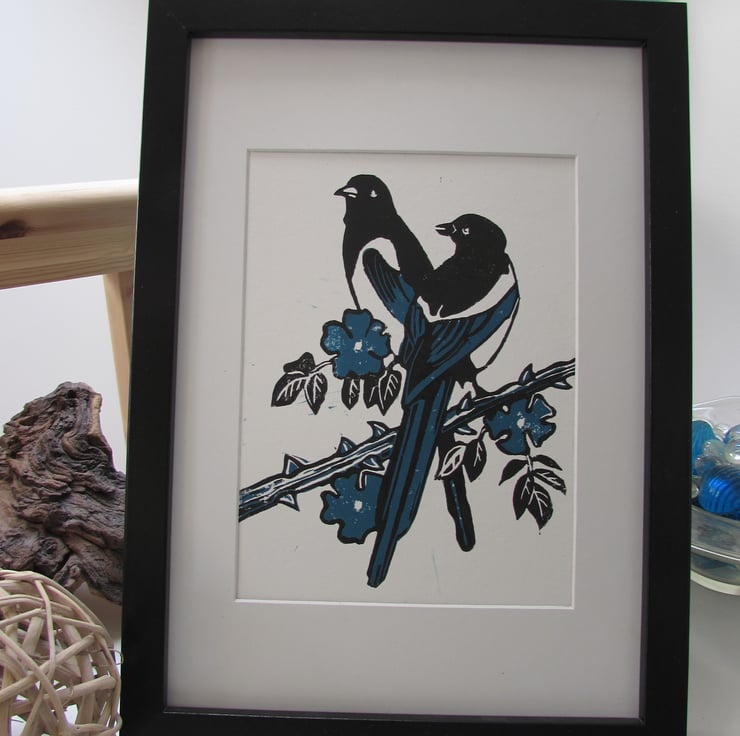 A hand made linocut multi-block print featuring a pair of Magpies 'Two for Joy' in a wild rose setting. The process results in small changes to each print so every print is unique. The inspiration for all my work listed is from travel, nature and the natural world. Printed on 300gsm, acid free, wood free printing cartridge paper. This series is created using high quality printing inks and designed to easily fit an A5 image size mount ( 148 x 210 mm) and frame as shown. Also suitable for a 6"x 8" aperture mount in a standard 8" x 10" frame. The print is unframed and unmounted. Dispatched in a hard back envelope for safe delivery with free UK shipping.